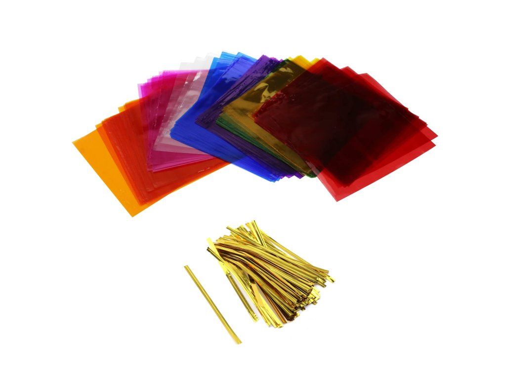 - Balení: 160 kusů celofánu v mixu barev včetně stahovacích drátků (twist ties)