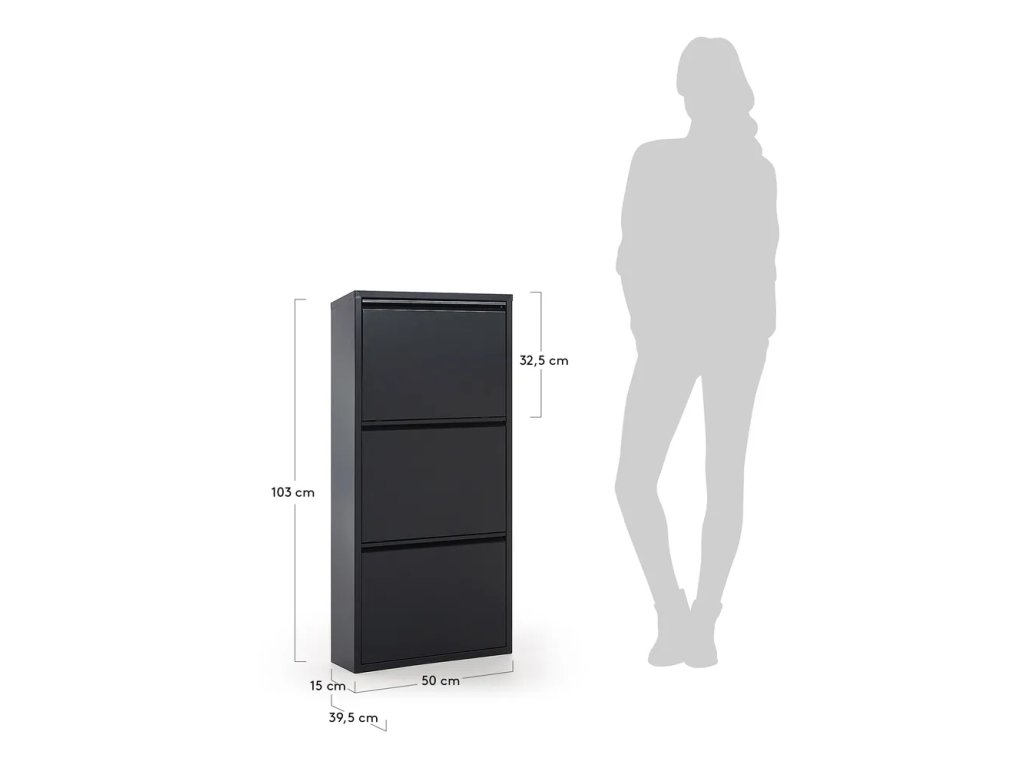 Tento černý botník Kave Home Rox je štíhlý a zároveň velmi prostorný. Díky vyklápěcímu systému celkem 3 dvířek poskytuje místo pro uskladnění všech vašich oblíbených párů a zároveň nezabírá mnoho místa. Botník je vyroben z odolného kovového materiálu. V zadní části najdete také otvory pro bezpečné upevnění ke zdi.