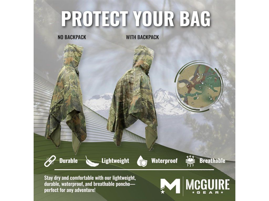 Obsah balení: 1× pláštěnka, 1× kompaktní přepravní taška. Technické údaje: materiál polyester, barva maskovací (javorový vzor), rozměry balení 27,6 × 19,2 × 5,3 cm, hmotnost cca 685 g, počet kusů 1, voděodolnost: nepromokavé, doporučené použití: turistika, kempování, cestování a nouzové situace.