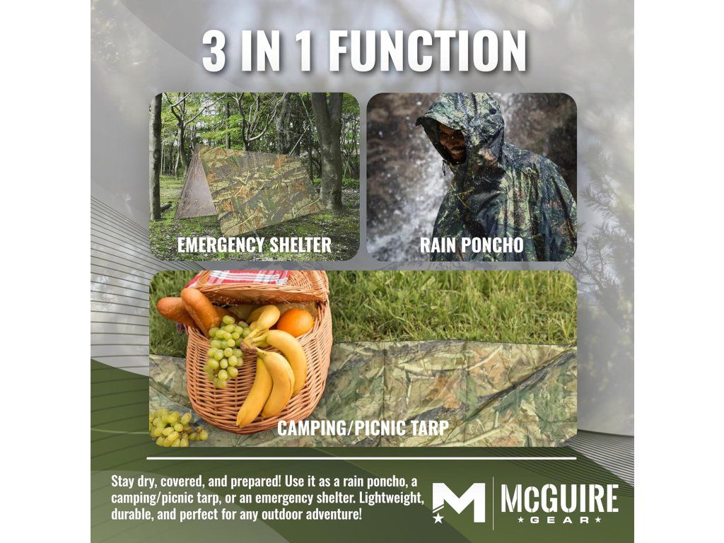 - Víceúčelové využití: čtyři očky v rozích umožňují pláštěnku použít jako nouzový přístřešek, kryt na zem nebo improvizovaný spacák.