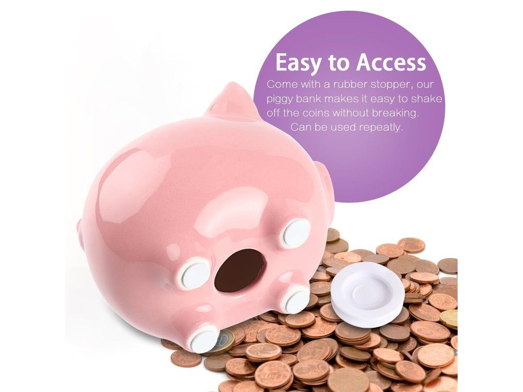 - Uzavírání: měkká gumová zátka ve spodní části pro snadné vyjmutí mincí bez rozbití pokladničky.