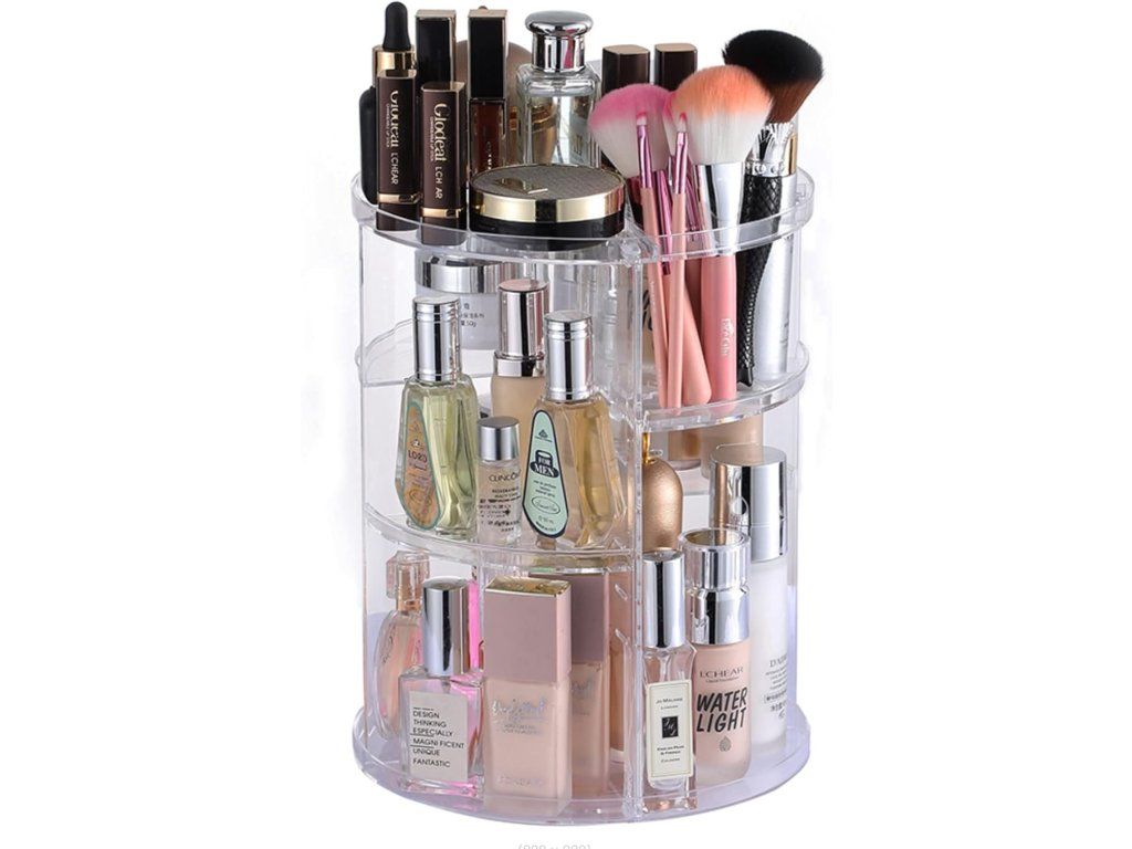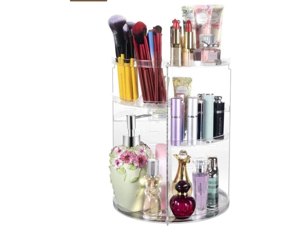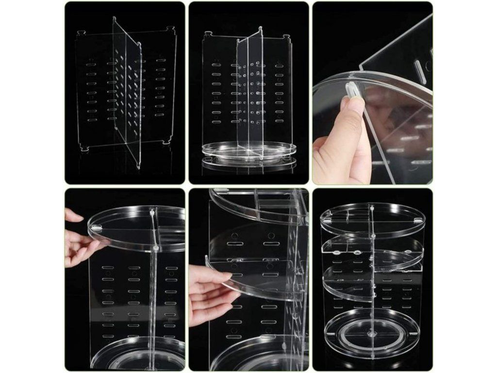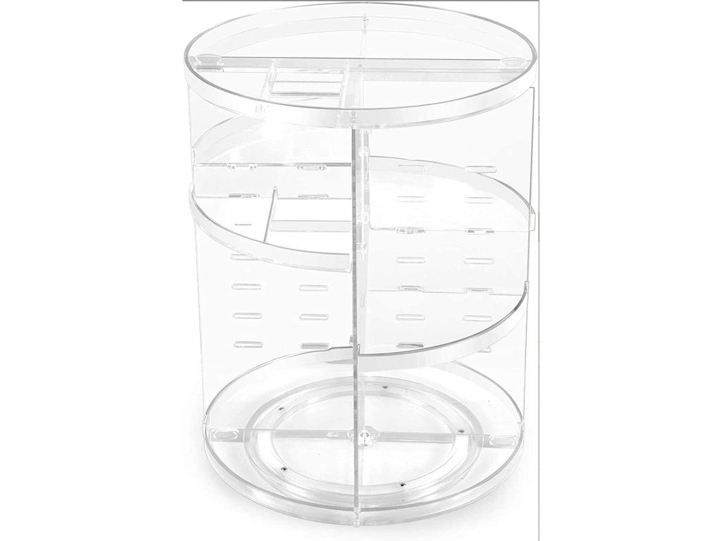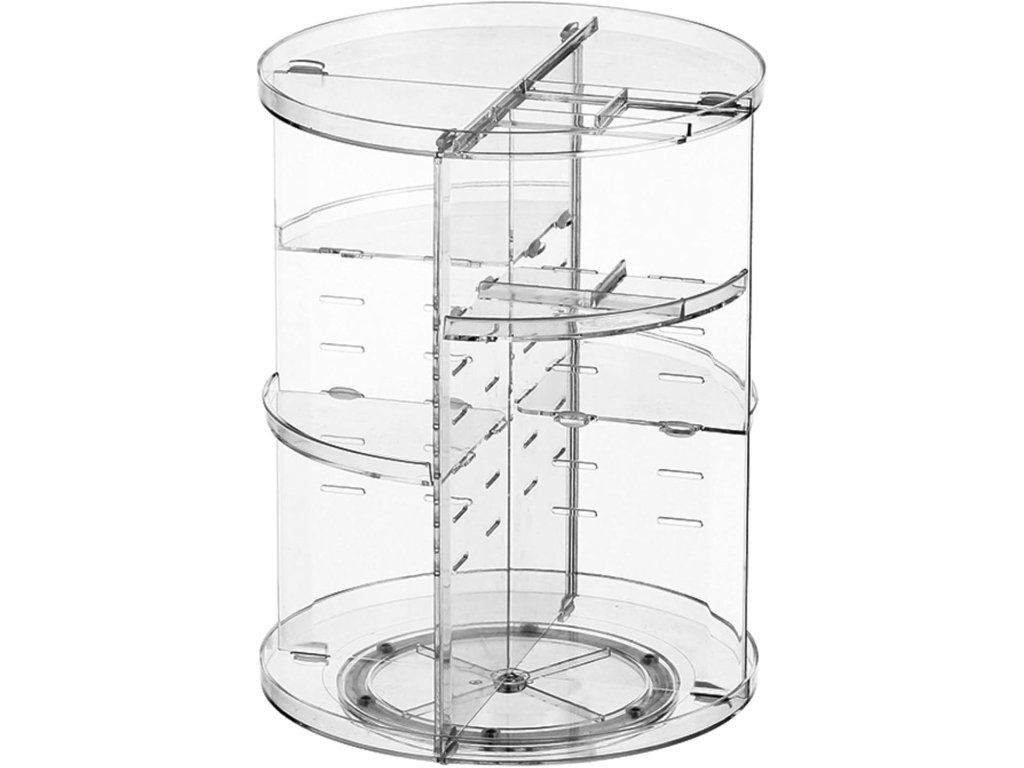 Praktický 360° otočný organizér na kosmetiku nabízí přehledné a úsporné uložení make-upu a doplňků – průhledné provedení usnadňuje rychlé nalezení, nastavitelné police pojmou různé velikosti výrobků a otočná základna zajišťuje pohodlný přístup ke všem přihrádkám.
