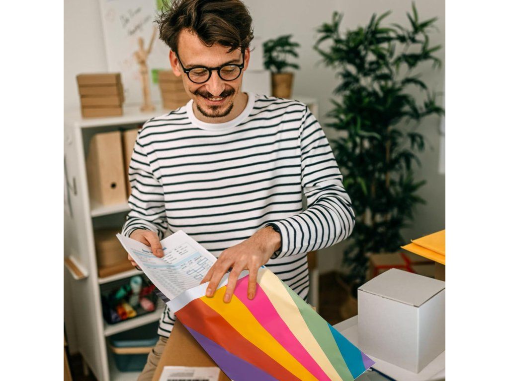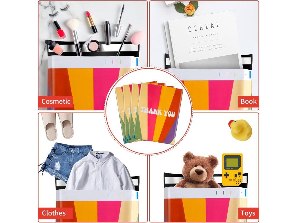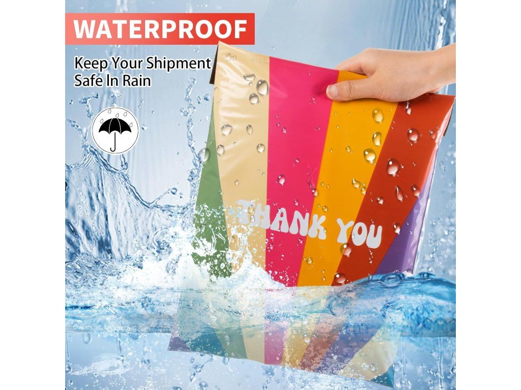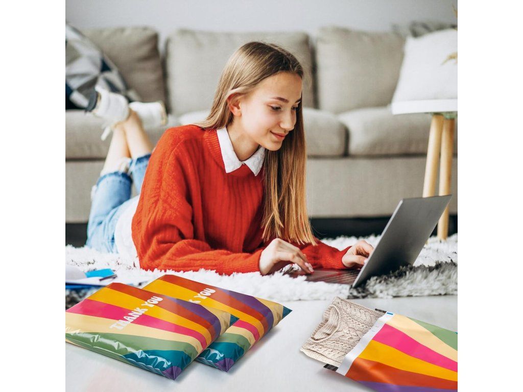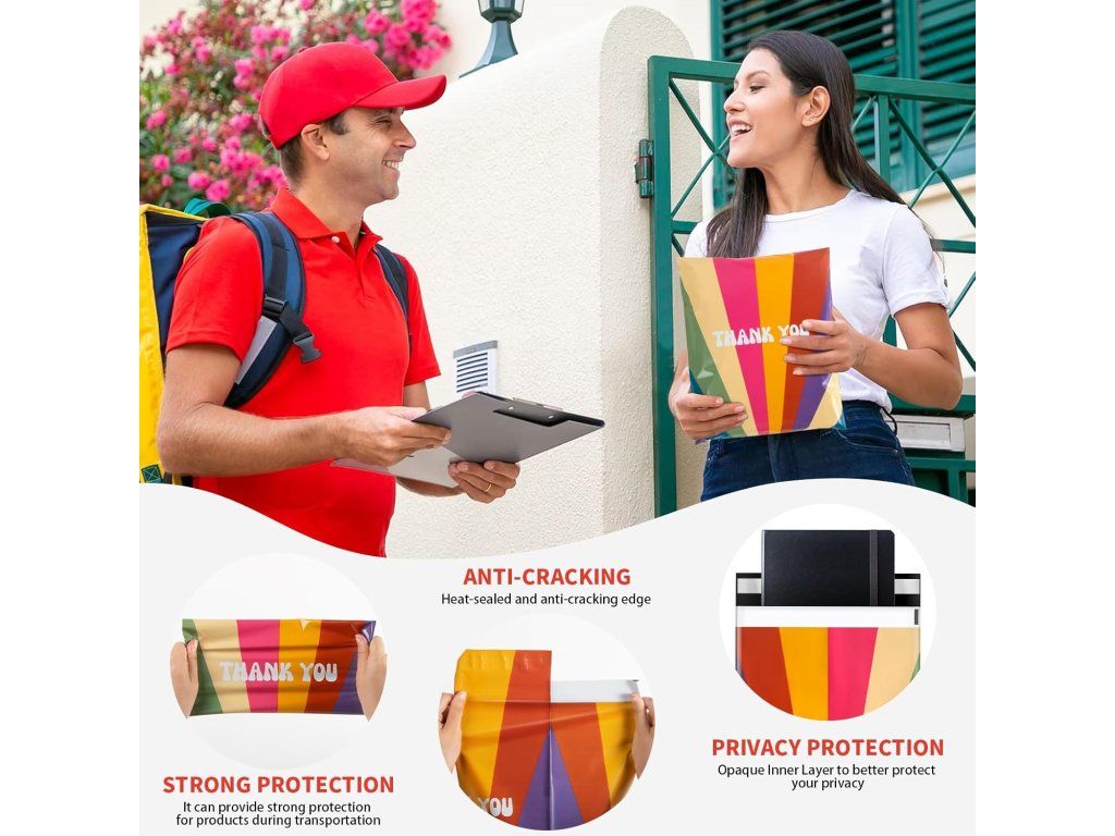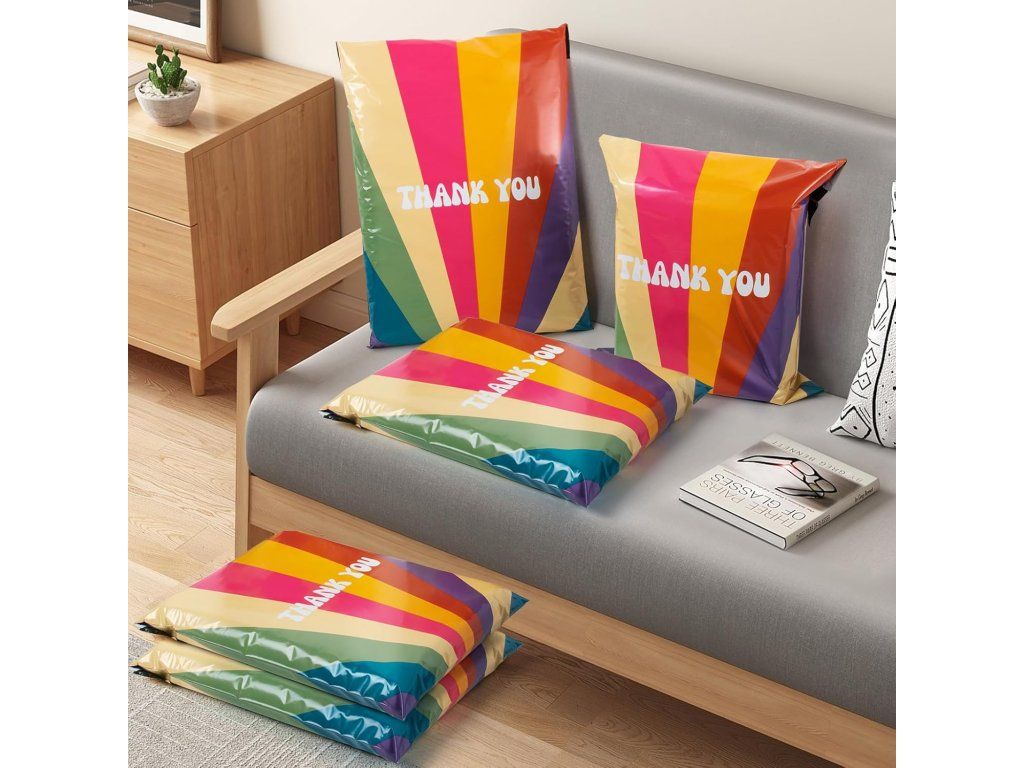 Praktické polymailery Oududianzi s atraktivním retro duhovým vzorem jsou ideálním řešením pro bezpečné zasílání oblečení, kosmetiky, knih a dalších drobných předmětů. Vyrobené z odolného polyethylenu chrání zásilky před vlhkostí a poškozením během přepravy.