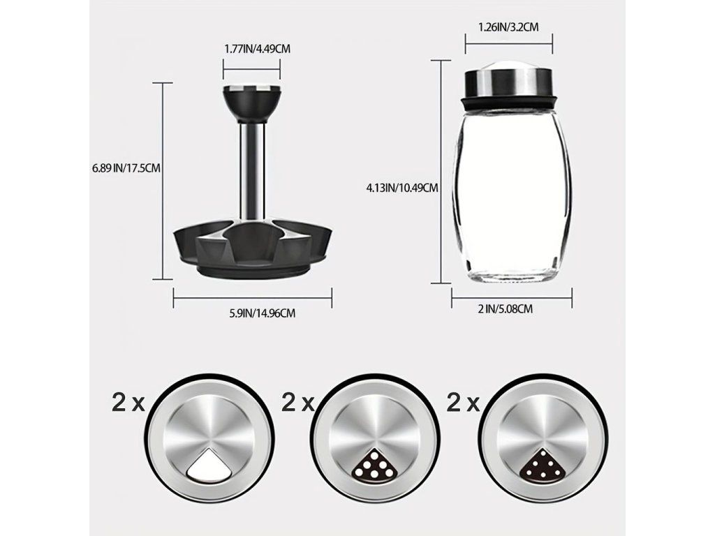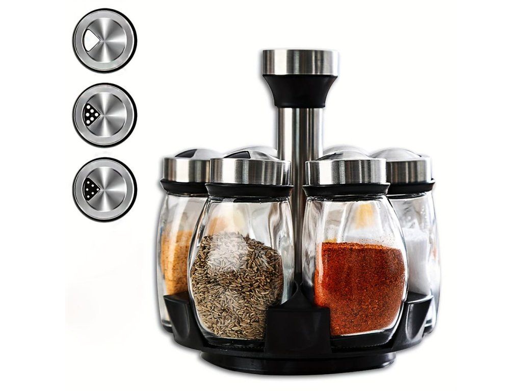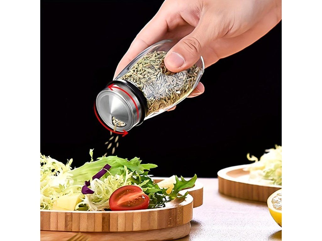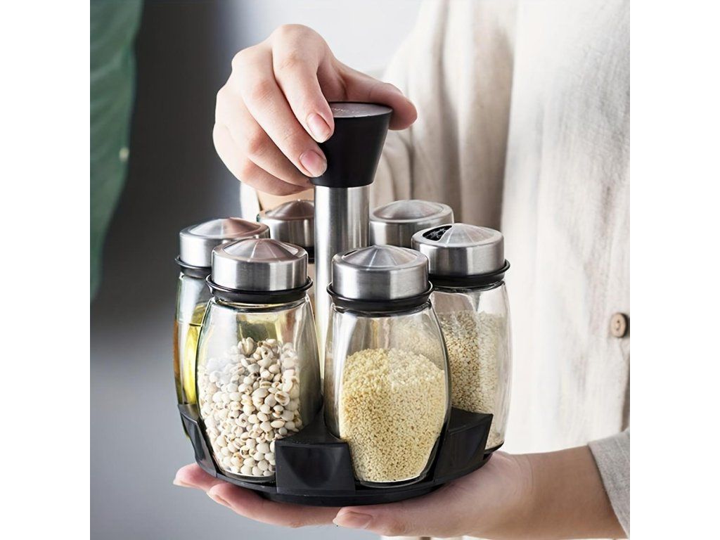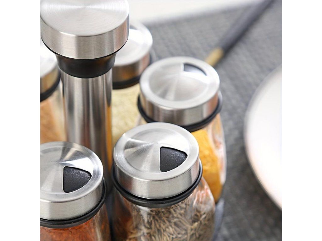 Každá nádoba je vyrobena z kvalitního skla, které pomáhá zachovat čerstvost a aroma uložených surovin. Otočný stojan 360° pro snadný přístup - 6 elegantních skleněných kořenek. Pro uchování a dávkování běžného koření.