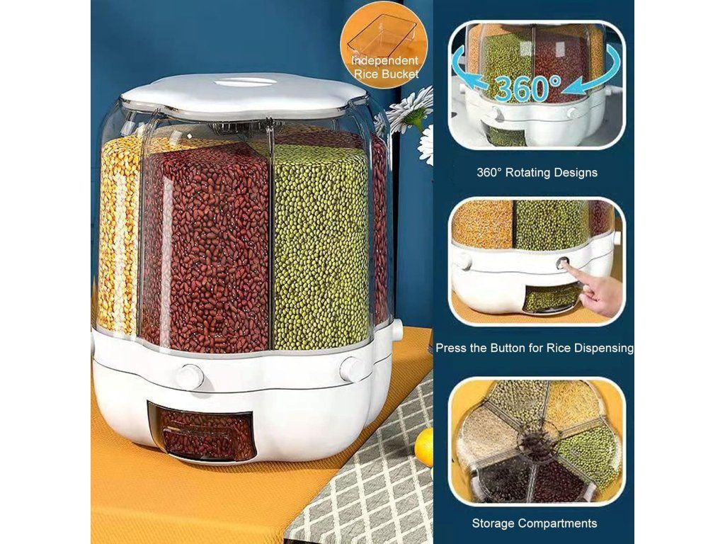 - Velká kapacita: Šest samostatných přihrádek umožňuje uložit více druhů obilovin bez vzájemného míchání, ideální pro rýži, ječmen, mungo, černou rýži nebo fazole.