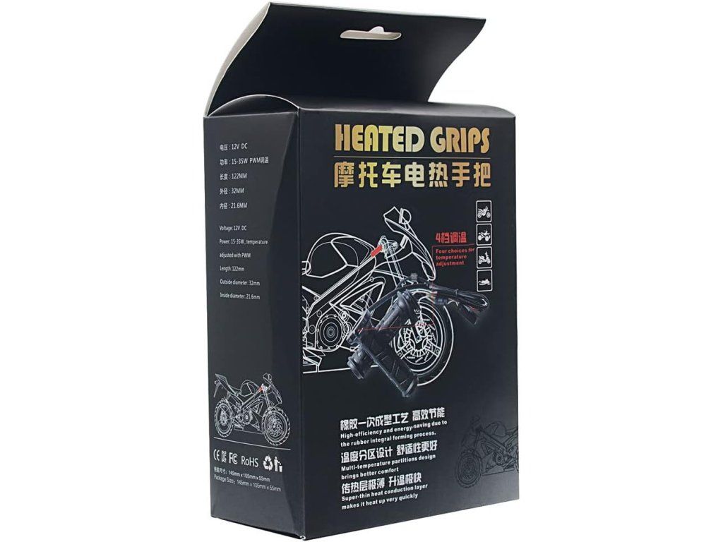 Obsah balení: 1 set vyhřívaných rukojetí. Technické údaje: napětí 12 V, výkon 12–24 W (nastavitelný), teplota 50–70 °C, levá rukojeť 143 × 36 mm, pravá rukojeť 127 × 36 mm, čistá hmotnost 260 g. Upozornění: může se lišit odstín podle nastavení monitoru; rozměry ±1 mm vzhledem k ručnímu měření.