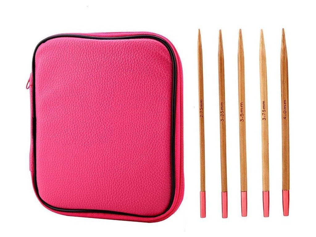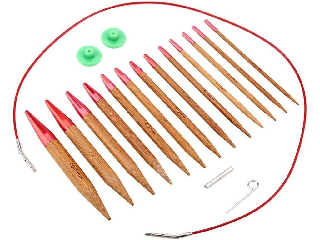 Obsah balení: 13 párů jehlic (velikosti 2,75–10 mm), 4 propojovací lanka, 4 zarážky/pozicní knoflíky, nástrojové pouzdro, mini-klíč, prodlužovací spojovací nástroj a PU taška pro přehledné uložení. Technické údaje: Materiál – karbonizovaný bambus a hliník; Barva – černá; Typ – kruhové pletací jehlice.