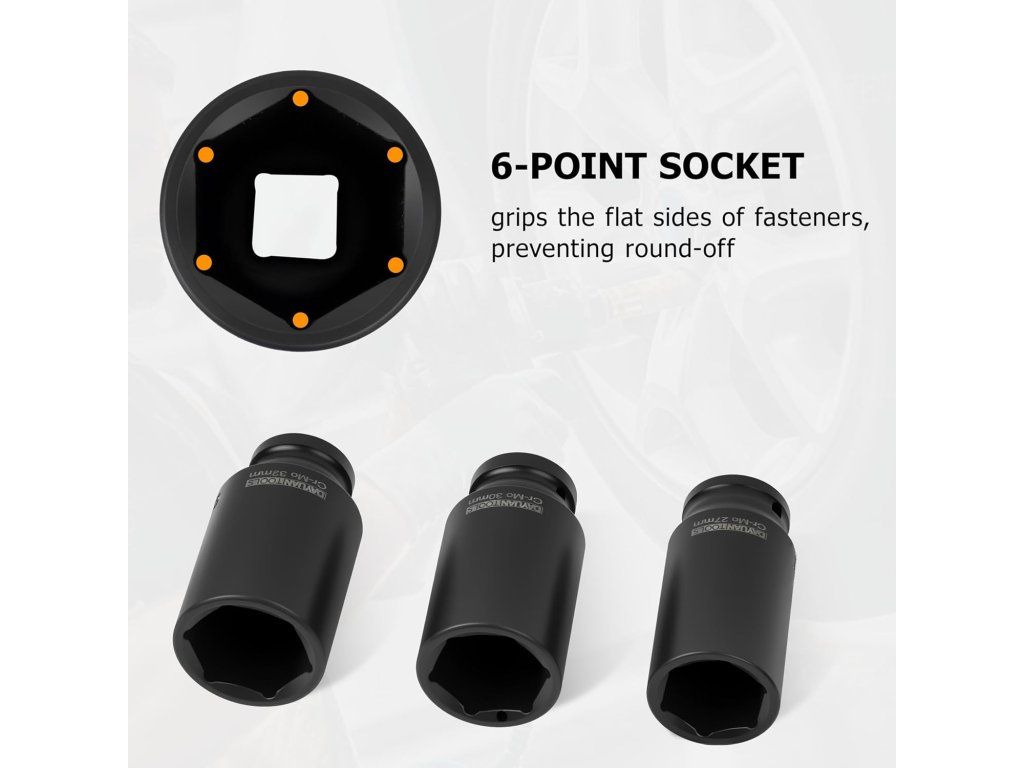 Praktická sada hlubokých nástrčných hlavic určená pro profesionální servisy i domácí dílny; kombinuje odolný materiál, přesné provedení a kovový kufřík pro bezpečné a přehledné uskladnění.