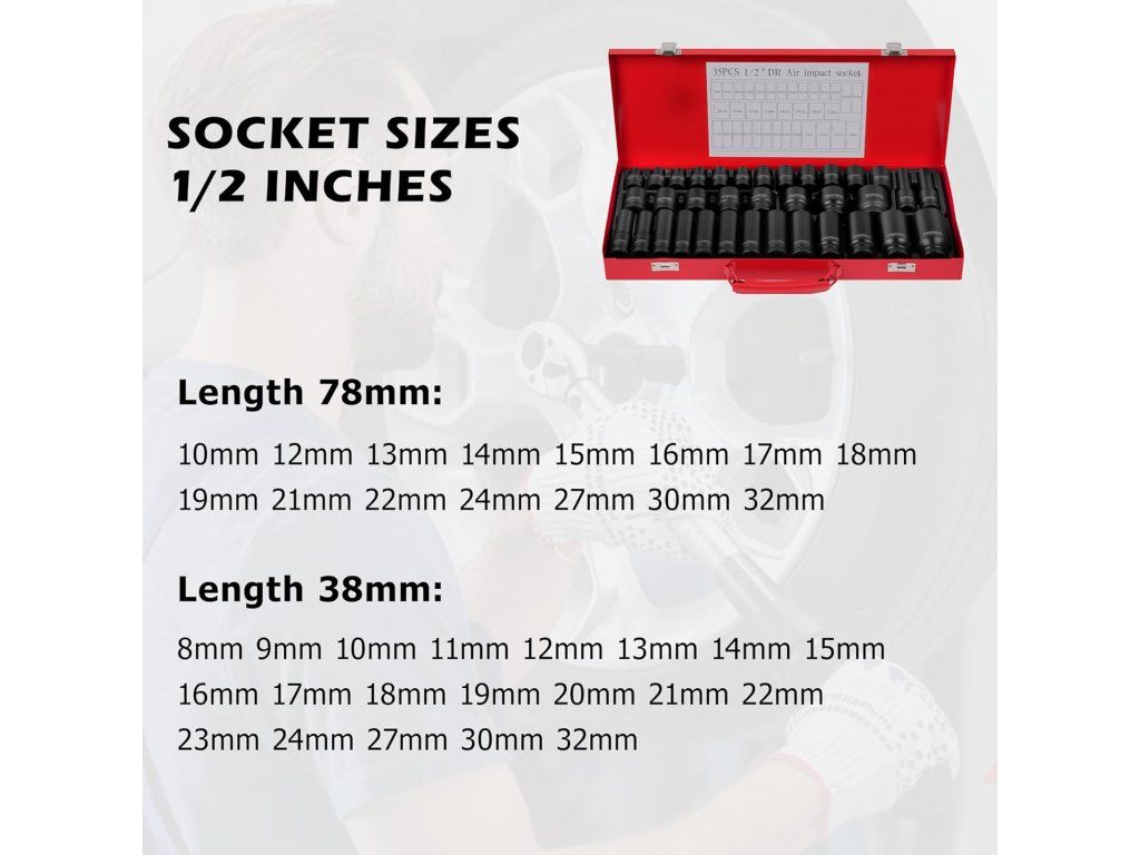 Obsah balení: 35× hlubokých nástrčných hlavic. 78 mm: 10,12,13,14,15,16,17,18,19,21,22,24,27,30,32 mm; 38 mm: 8,9,10,11,12,13,14,15,16,17,18,19,20,21,22,23,24,27,30,32 mm. Technické údaje: model YT-98065, materiál chrom-molybdenová ocel, povrch černý oxid, hmotnost cca 7,25 kg, výrobce Yinyuan Tools, země původu Čína.