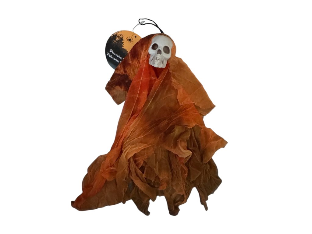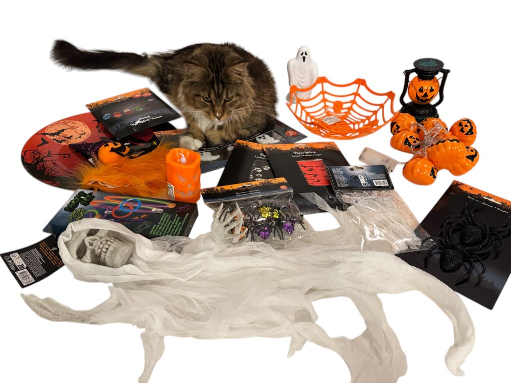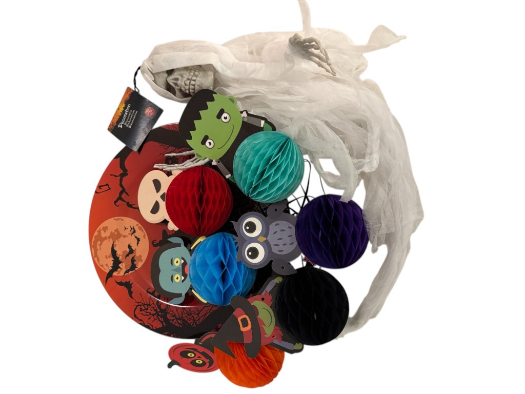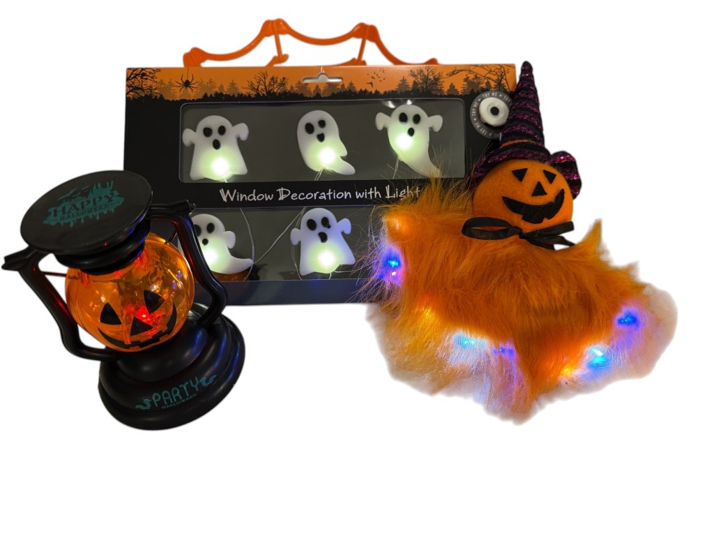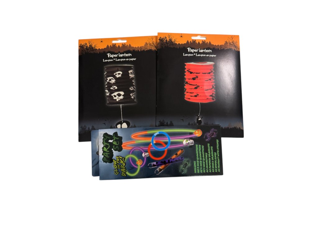 LED dýňová světýlka, plyšovou svítící dýni-strašáka, dekorační podtác, plastový dekorační košík, LED svíčku, náramky svítící ve tmě, velkou bílou závěsnou smrtku, třpytivé malé pavoučky, 3 třpytivé červené pavouky, 2 ks papírových lampionů, závěsné kostlivce svítící ve tmě, lucernu-dýni, závěsného barevného ducha, bílého plastového svítícího ducha, papírovou girlandu s duchy, LED svítící gelovou dekoraci na sklo.