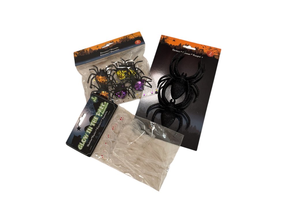 Velká sada čítající 17 kusů různých halloweenských dekorací za super výhodnou cenu! Dýně, kostlivci, pavouci, LED světýlka bez toho prostě není správný Halloween nemůže být.