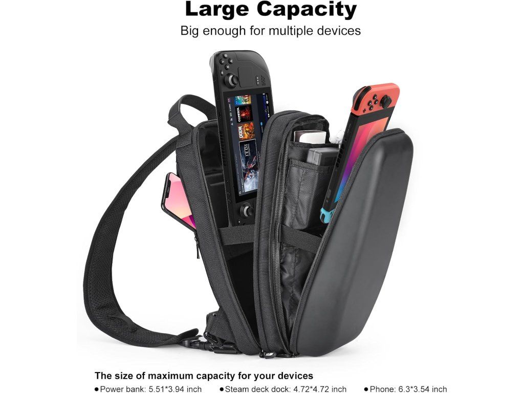 - Přizpůsobeno pro Steam Deck – tvarované vybrání a vícevrstvé úložiště pojmou Steam Deck, Nintendo Switch a doplňky tak, aby vše pevně drželo na svém místě.