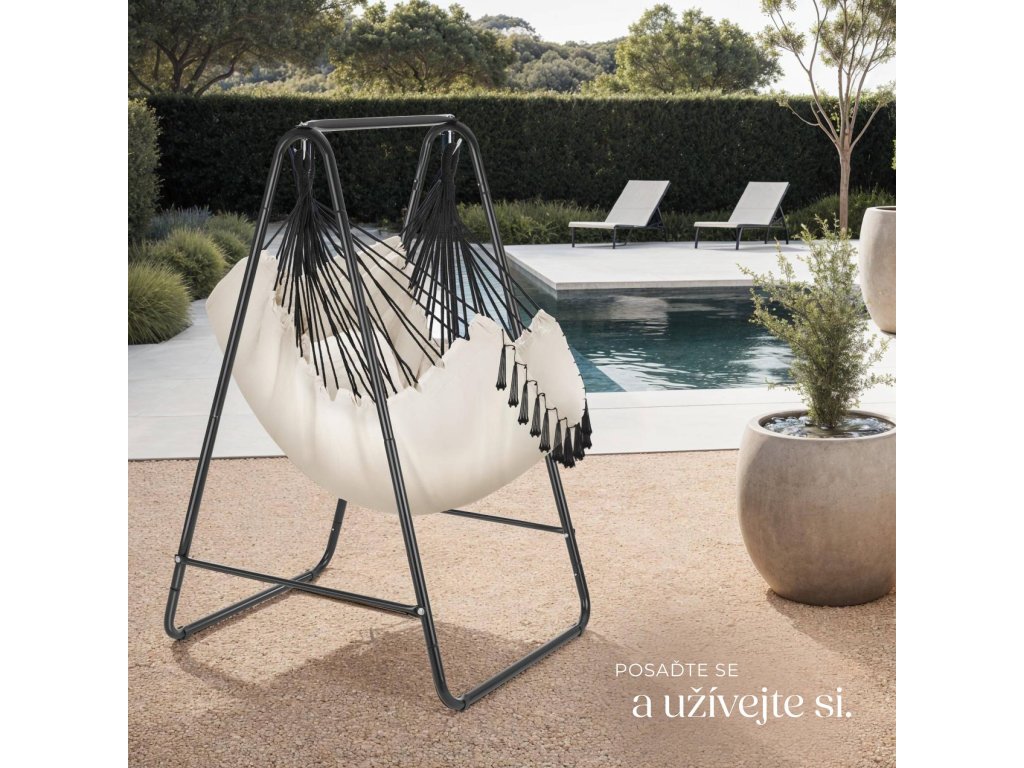 Závěsné křeslo přichází včetně pevného ocelového rámu, který je díky práškovému povrchu mimořádně odolný a stabilní. Podlahově přátelské a protiskluzové plastové klipy navíc poskytují nejvyšší stabilitu. Ať už v obývacím pokoji, na terase nebo na zahradě – křeslo vám vytvoří pohodlné místo k odpočinku.