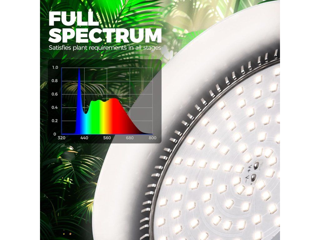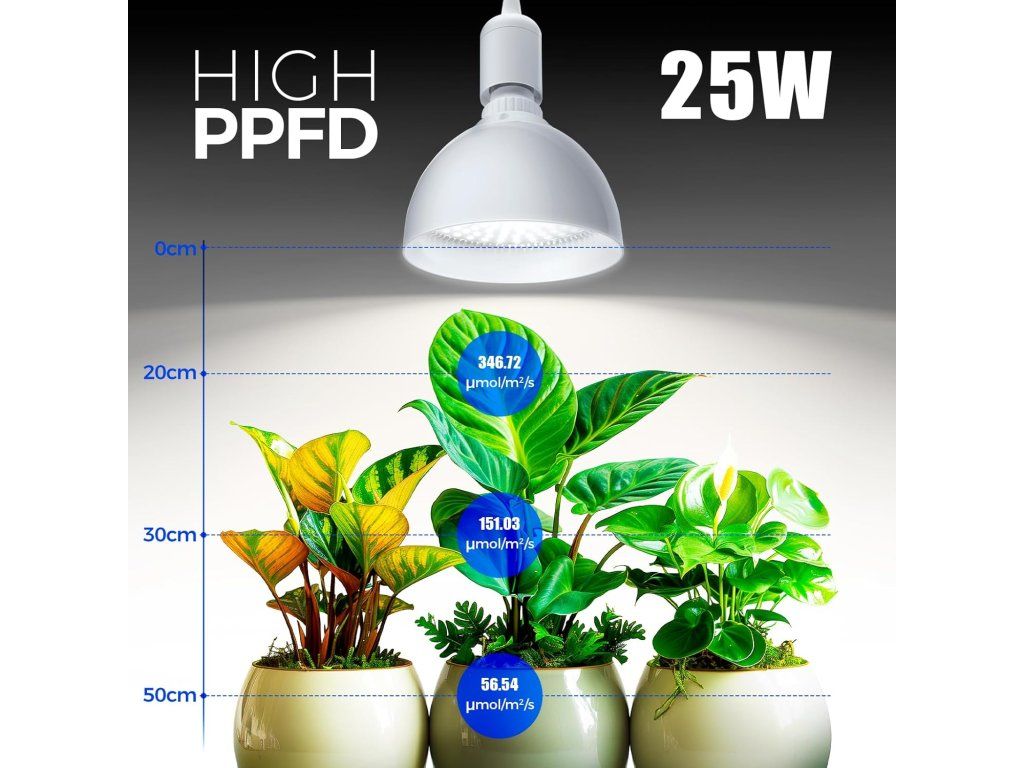 - Vysoký PPFD: 120 × 0,5W LED čipů, PPFD až 385 μmol/s/m² (měřeno ve výšce 8"), světelný tok 2100 lm při nízké spotřebě 25 W.