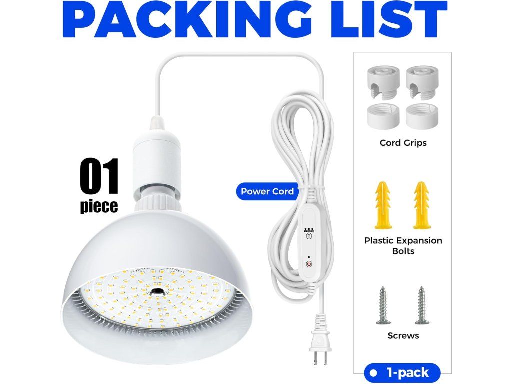 Obsah balení: 1× Barrina LED závěsné světlo pro rostliny (PAR38), 1× přívodní kabel s časovačem (16,4 ft), 1× montážní příslušenství, 1× instalační manuál. Technické údaje: výkon 25 W, světelný tok 2100 lm, barevná teplota 5000 K, CRI 98+, patice E26, třída výrobce Bailina Lighting, záruka 2 roky.