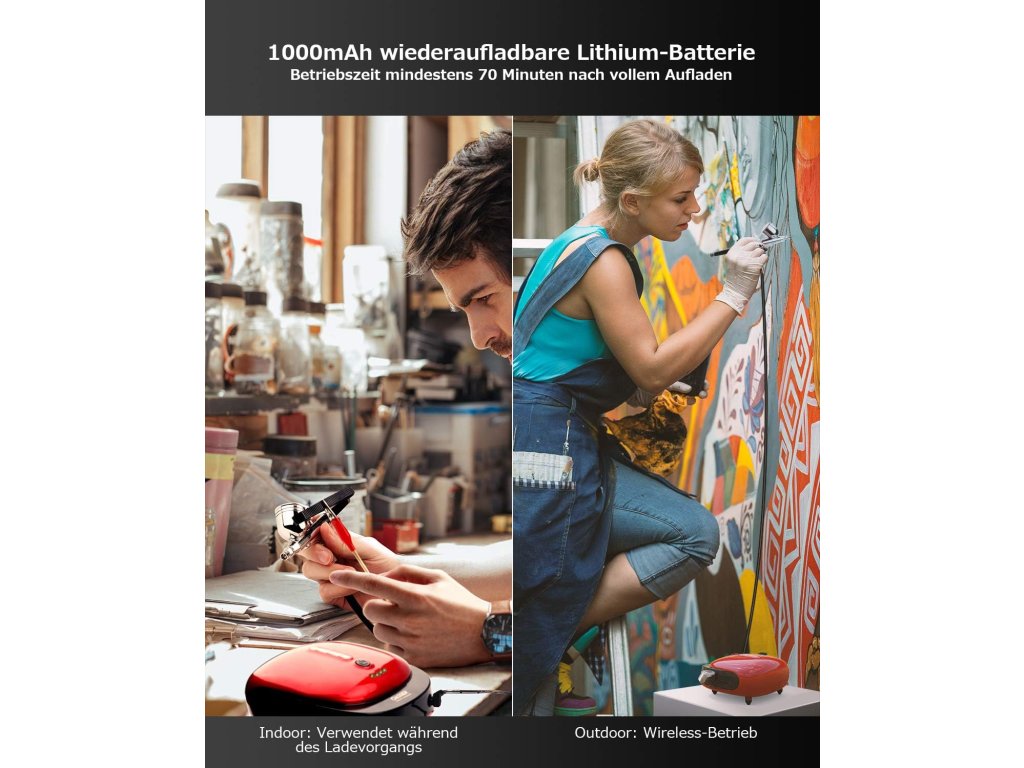 Oasser airbrush sada nabízí přenosné a tiché řešení pro modeláře, drobné lakovací práce, dekorování i kreativní projekty. Díky dobíjecímu akumulátoru, třem přednastaveným úrovním tlaku a ergonomické dvojčinné pistoli dosáhnete přesných výsledků i při delší práci.