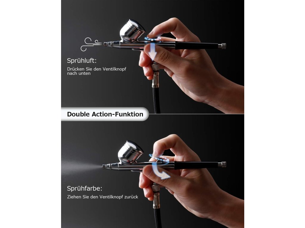 - Precizní dvojčinná pistole: Tryska 0,3 mm a 7 cc nádobka umožňují plynulé ovládání množství vzduchu i barvy pro přesné stříkání různých efektů.