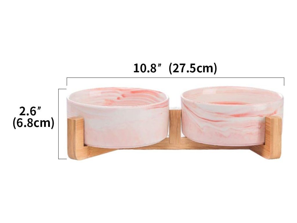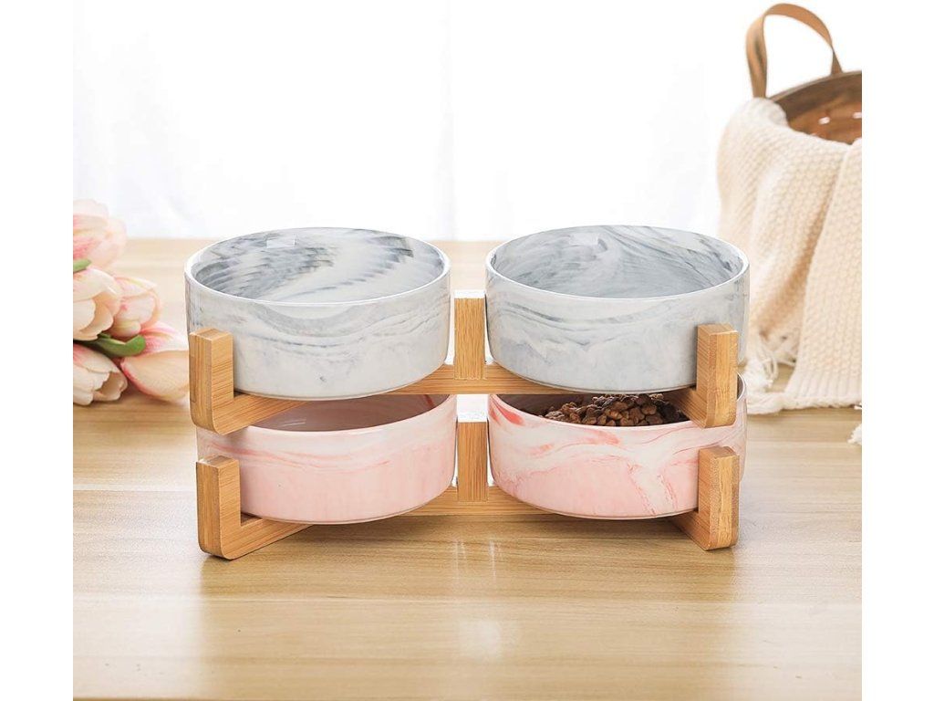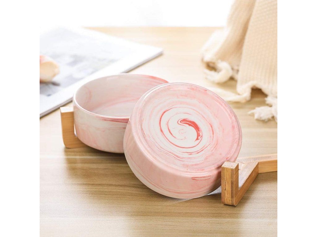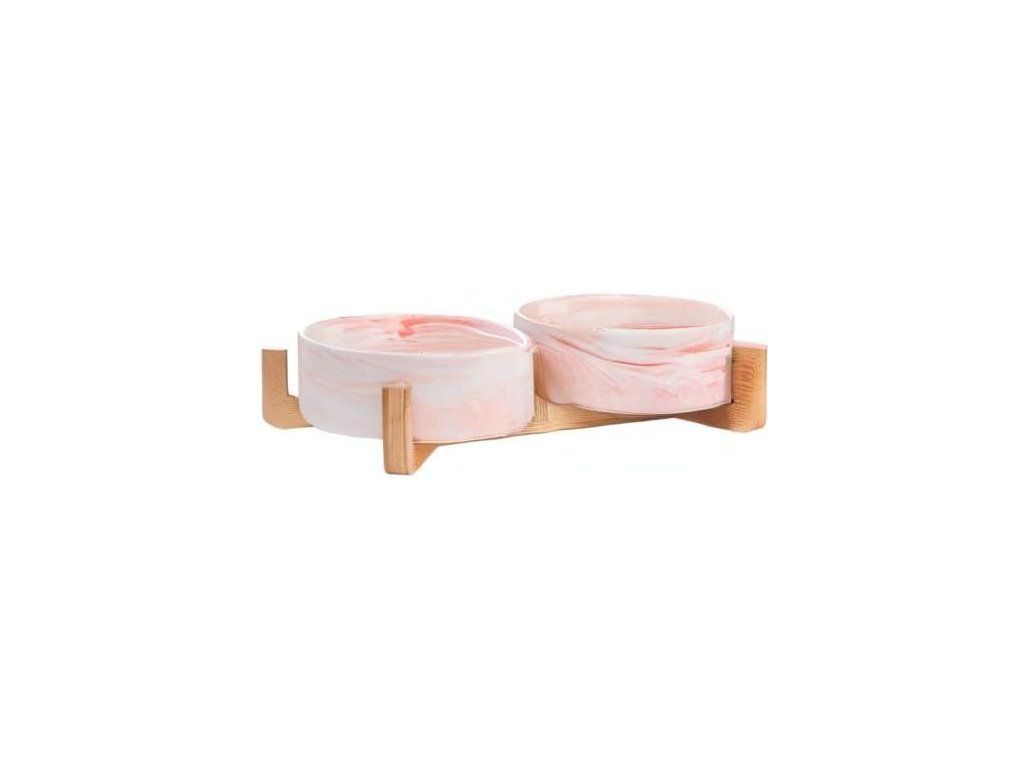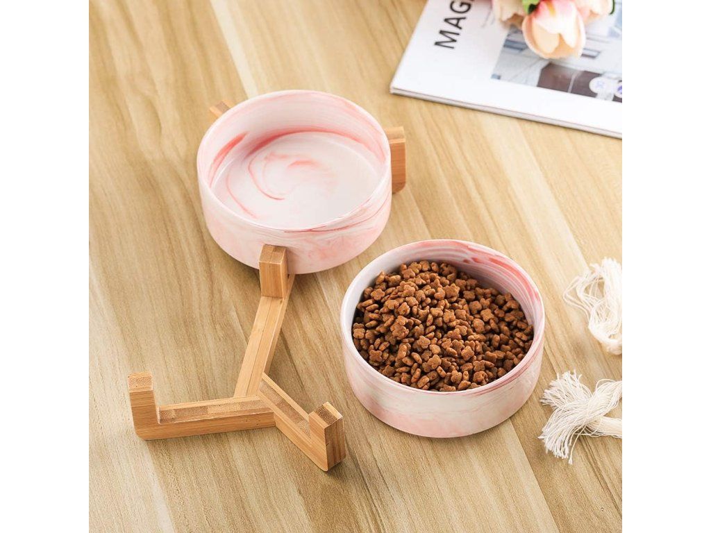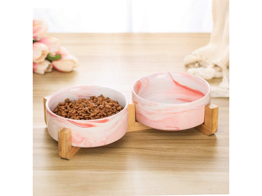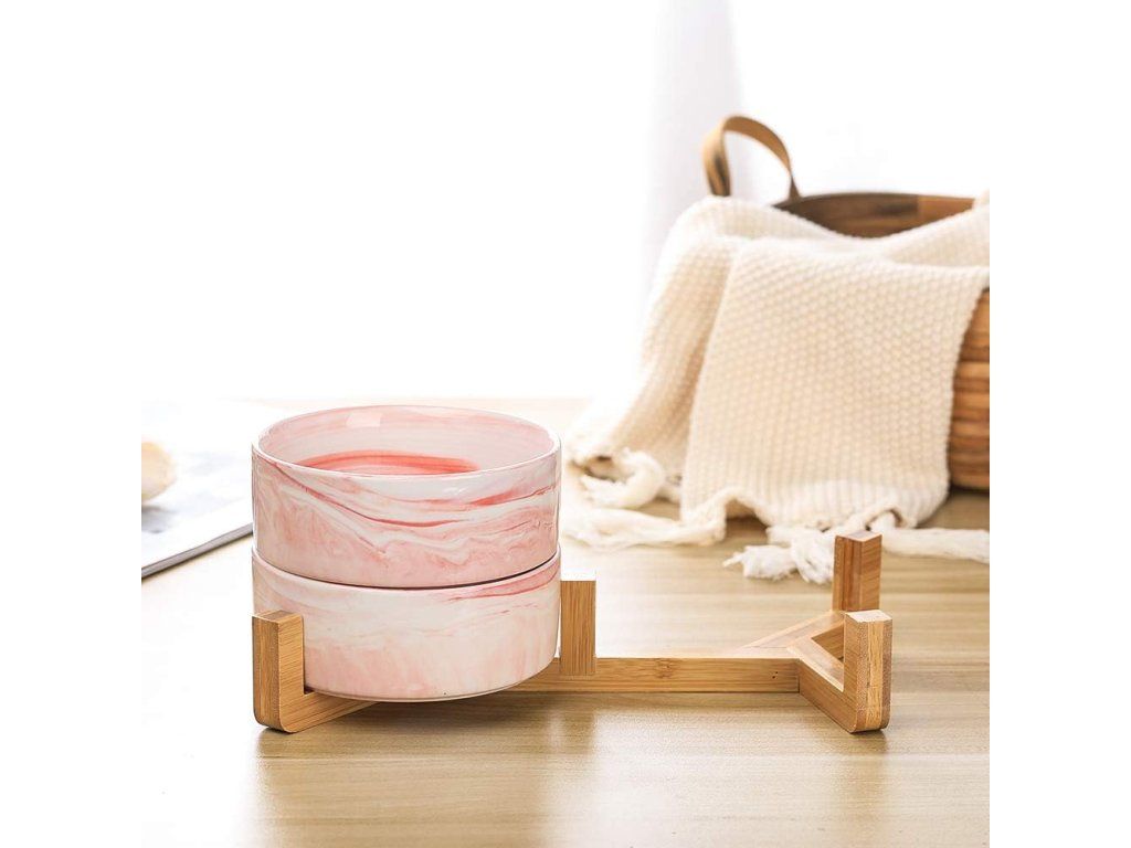 Stylová mramorová růžová miska z porcelánové keramiky v sadě po dvou s protiskluzovým dřevěným stojanem – bezpečné a praktické řešení pro krmení a napájení koček a malých plemen psů.