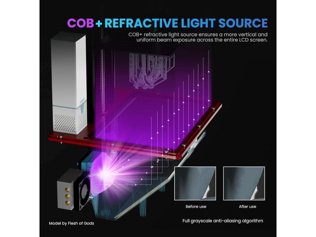 - COB+ refrakční světelný zdroj – rovnoměrné 405 nm osvětlení po celé ploše displeje v kombinaci s pokročilým anti-aliasingem pro realističtější detaily.