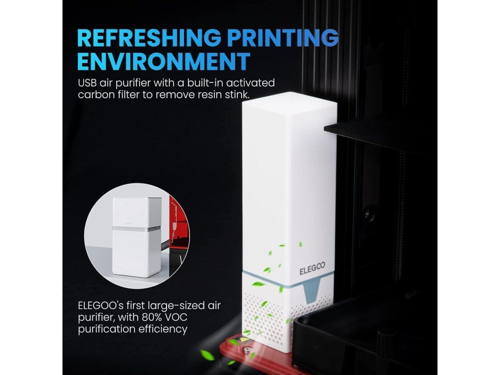 - Redukce zápachu – možnost připojení USB čističky vzduchu s aktivním uhlíkovým filtrem pro snížení pachů v tiskové komoře (možnost dokoupení větší čističky ELEGOO pro odstranění formaldehydu a až 80 % VOC).