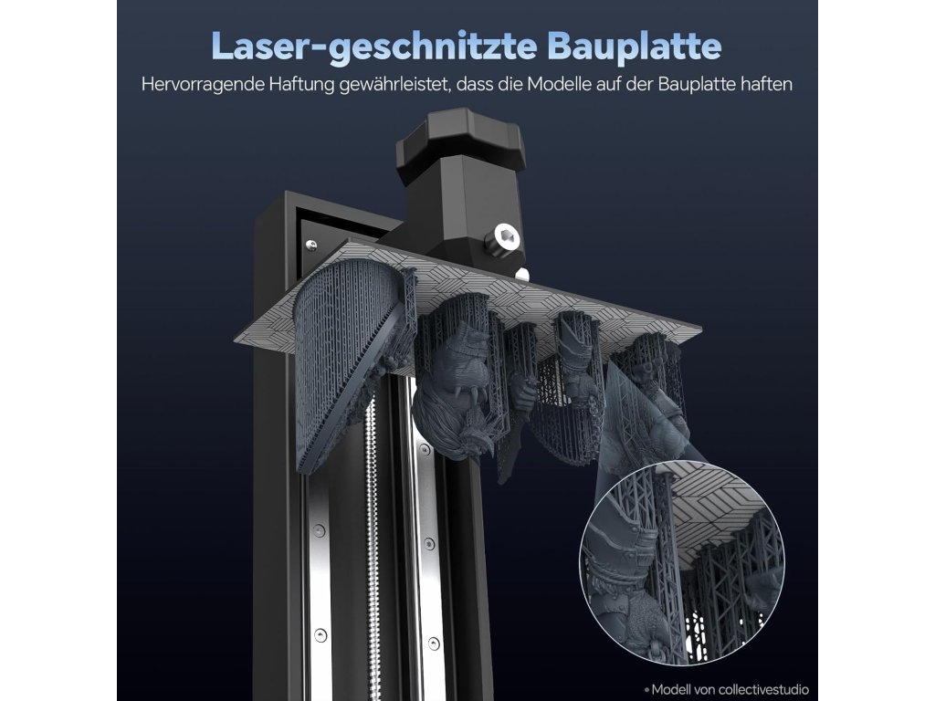 - Laserem gravírovaná tisková deska: Povrch desky je laserově upravený pro vynikající přilnavost, která zabraňuje odtržení modelů během tisku a zvyšuje úspěšnost výtisků.
