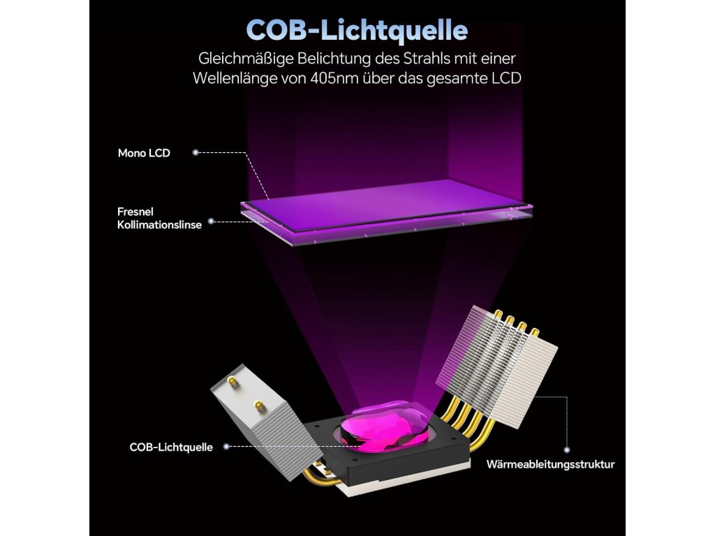 - COB světelný zdroj: Výkonný COB zdroj s vlnovou délkou 405 nm zajišťuje rovnoměrné vystavení přes celé LCD a konzistentní výsledky tisku.