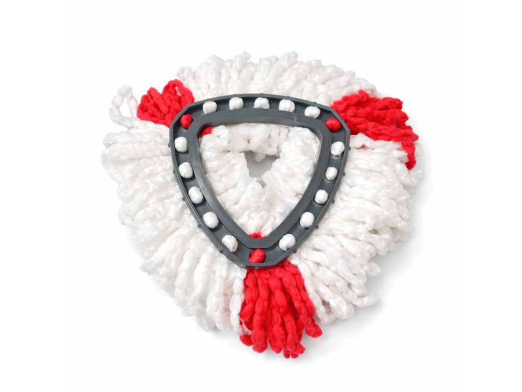 Obsah balení: 4× náhradní mikrovláknové hlavice mopu (červené). Průměry hlavice: vnitřní cca 9,9 cm, vnější strana trojúhelníku cca 14,5 cm
