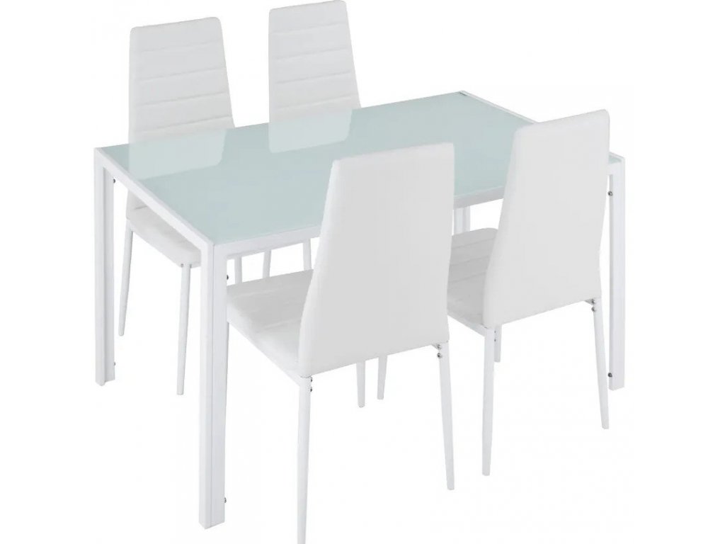Elegantní jídelní sestava tectake se vyznačuje atraktivním designem a klasickým, čistým vzhledem, proto se výborně hodí do jakéhokoliv prostředí. Čtyři židle poskytují vysoký komfort sezení, jejich povrch ze syntetické eko-kůže se velmi často čistí i udržuje. Stůl je osazen pěknou a odolnou deskou z bezpečnostního skla. Přes svůj štíhlý a jemný vzhled je celý jídelní set velmi odolný a stabilní. Nohy jsou opatřeny plastovými krytkami, které chrání podlahovou krytinu. Díky nízké hmotnosti lze sestavu snadno přemisťovat. Dopřejte si stylový nábytek a kupte si jídelní set tectake.