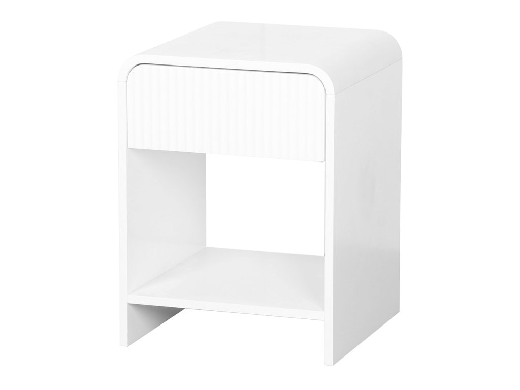 Moderní design: Bílý noční stolek se zaoblenými rohy a jemnou žebrovanou texturou na zásuvce pro luxusní vzhled.