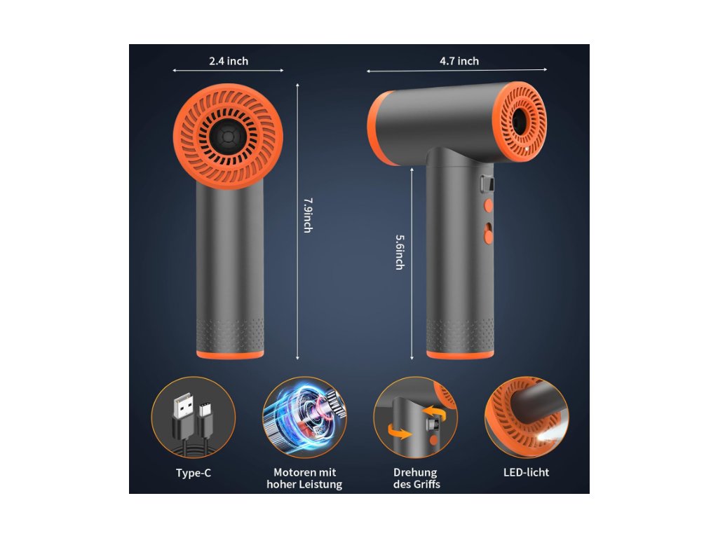 - Módní a snadné použití Náš elektrický prachový ventilátor je vybaven LED osvětlením a digitálním displejem, který dokáže snadno uzavřít odstranění prachu v tmavých rozích a zná stav baterie; vybavený otočnou rukojetí pro snadnou manipulaci, s průběžnou rukojetí se pohodlně drží; odnímatelná konstrukce trysky pro snadnou přepravu a skladování; má přípojku typu C pro rychlé nabíjení.