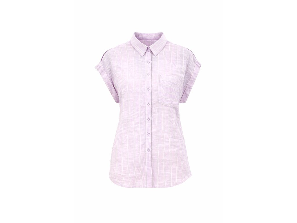 Dámská halenka ve světle fialovém odstínu se slabými bílými proužky je kvalitně zpracována z 63% viskózy, 37% bavlny. Halenka je bez rukávů, na bocích má malé rozparky. Je jemná a vzdušná pro pohodlné nošení.