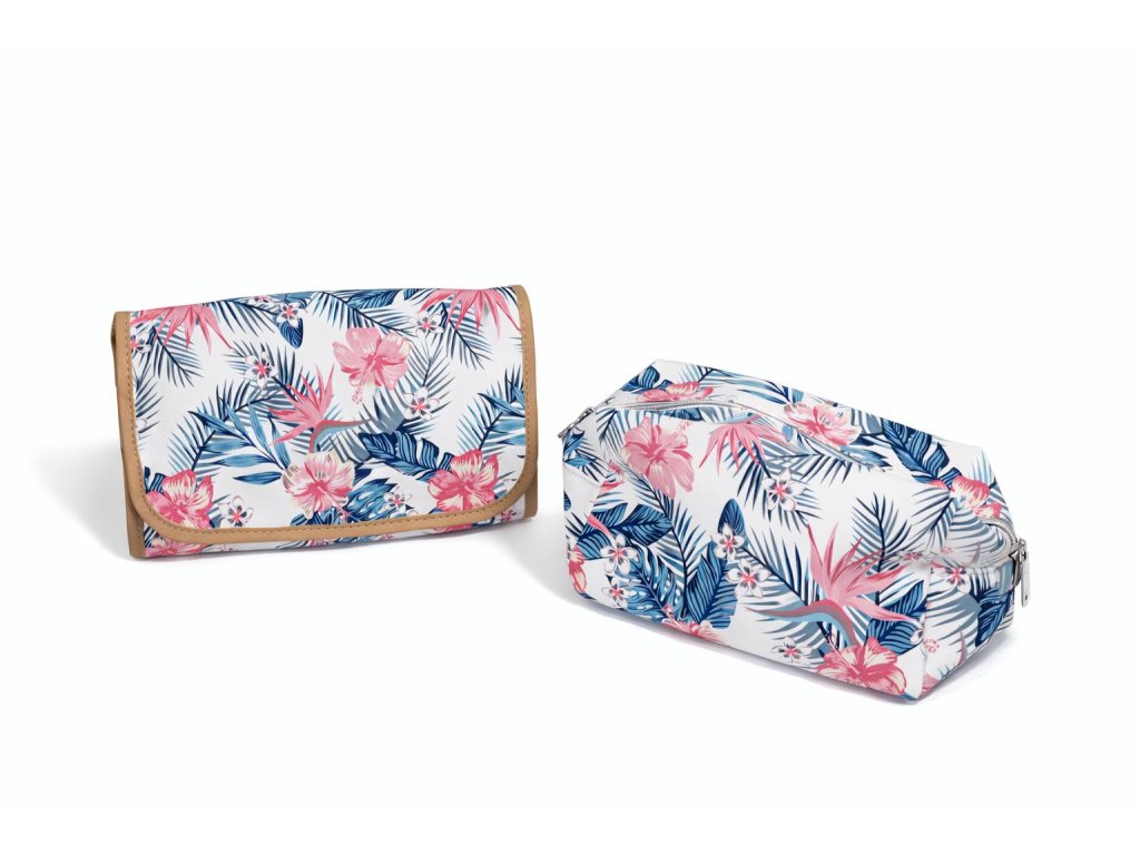 Sada praktických kosmetických tašek s motivem květin a listů. Sada obsahuje jednu tašku s rozměry 18 x 24,3 x 4,5 cm, která má praktickou možnost zavěšení. Druhá menší taštička (12 x 20 x 9,5 cm) má jednu přihrádku.