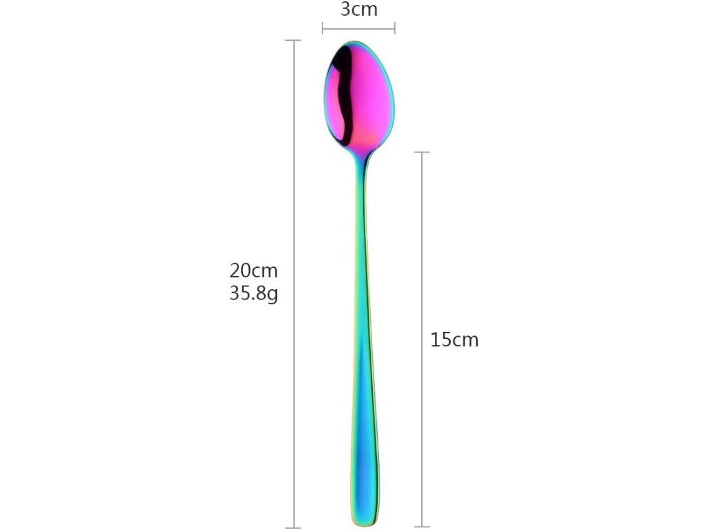 Obsah balení: 8× dlouhé lžičky. Technické údaje: rozměry 20 × 3 cm, hmotnost sady cca 35,8 g. Barevné provedení a povrch odpovídají fotografiím produktu.