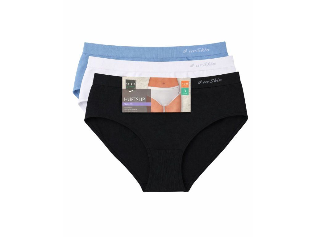 Balení obsahuje 3ks kalhotky, které jsou v barvě černá, bílá a světle modrá.