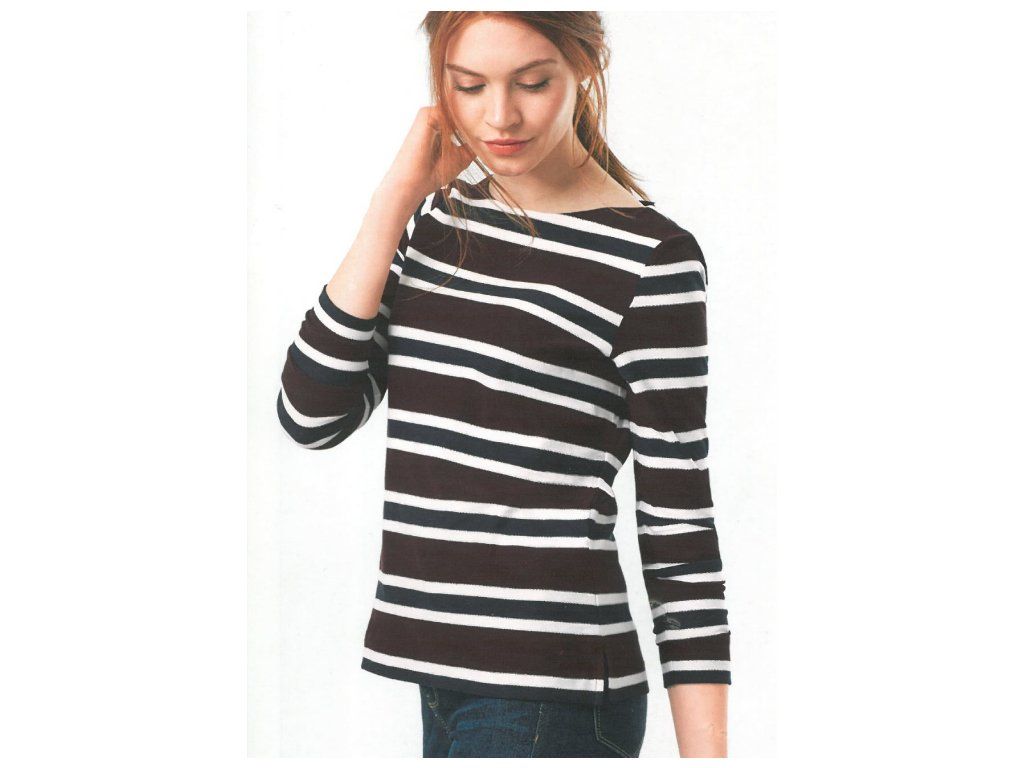 Dámský bavlněný svetr je z příjemné čisté bavlny. Má na sobě černobílé proužky na syté vínové barvě, je rovného střihu, v dolním okraji má malý rozparek.