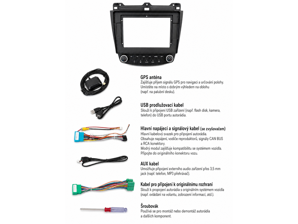 Součástí sady je kompletní montážní příslušenství včetně kabelových adaptérů, které usnadňují připojení bez nutnosti zásahu do původní elektroinstalace vozidla. Integrovaný panel klimatizace umožňuje zachování plné funkčnosti ovládání topení a klimatizace.