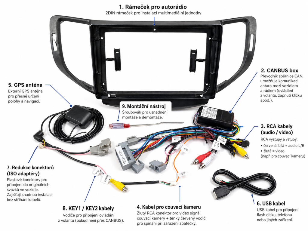 Součástí sady je kompletní instalační příslušenství, včetně kabelových svazků pro snadné zapojení, CAN-BUS modulu (pokud je součástí konkrétní varianty), anténního adaptéru a dalších konektorů. Instalace je tak rychlá a bez nutnosti složitých zásahů do elektroinstalace vozidla.