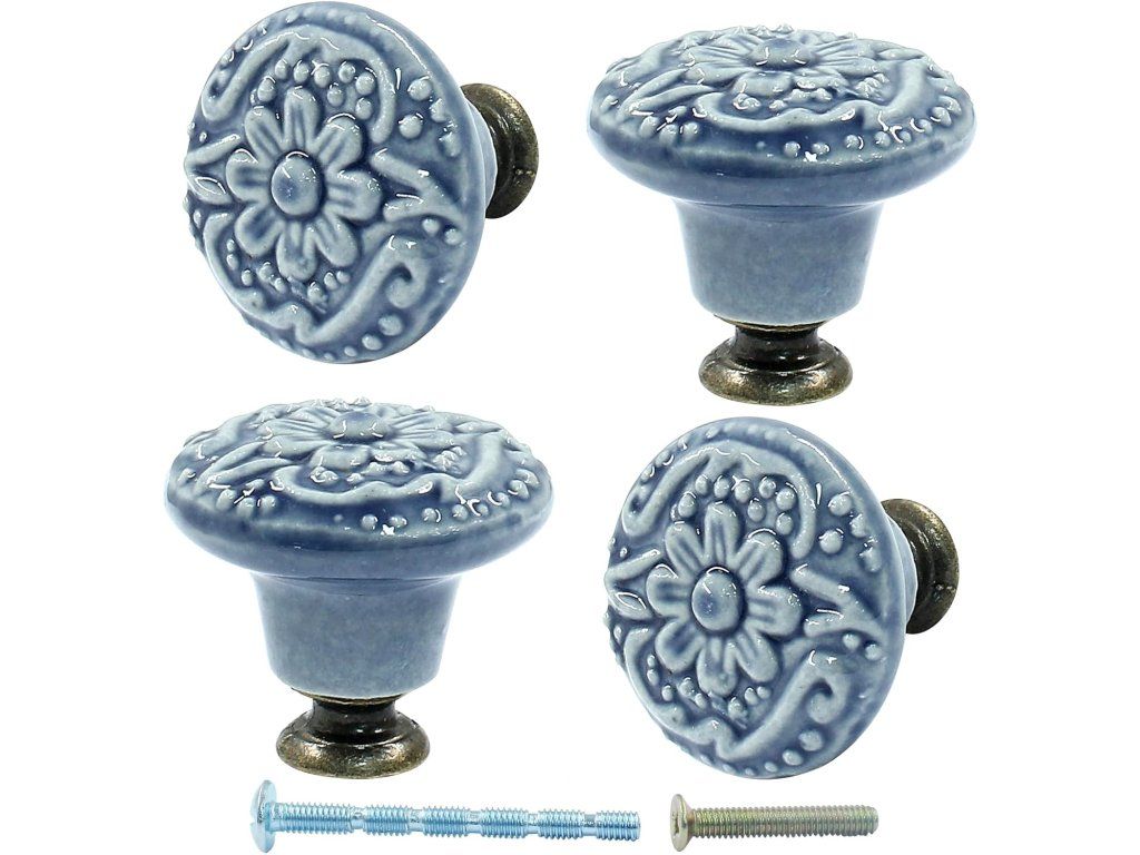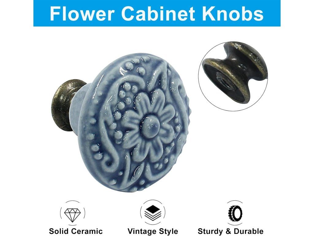 Oživte svůj nábytek jemným retro stylem — světle modré keramické úchytky s květinovým reliéfem dodají kuchyni, ložnici i předsíni stylový a útulný vzhled. Kvalitní keramika v kombinaci s kovovou základnou zajišťuje dlouhou životnost a pevné uchycení.