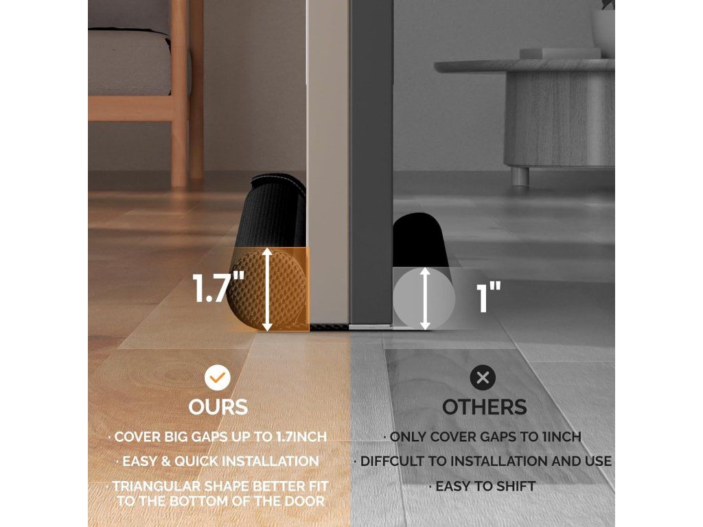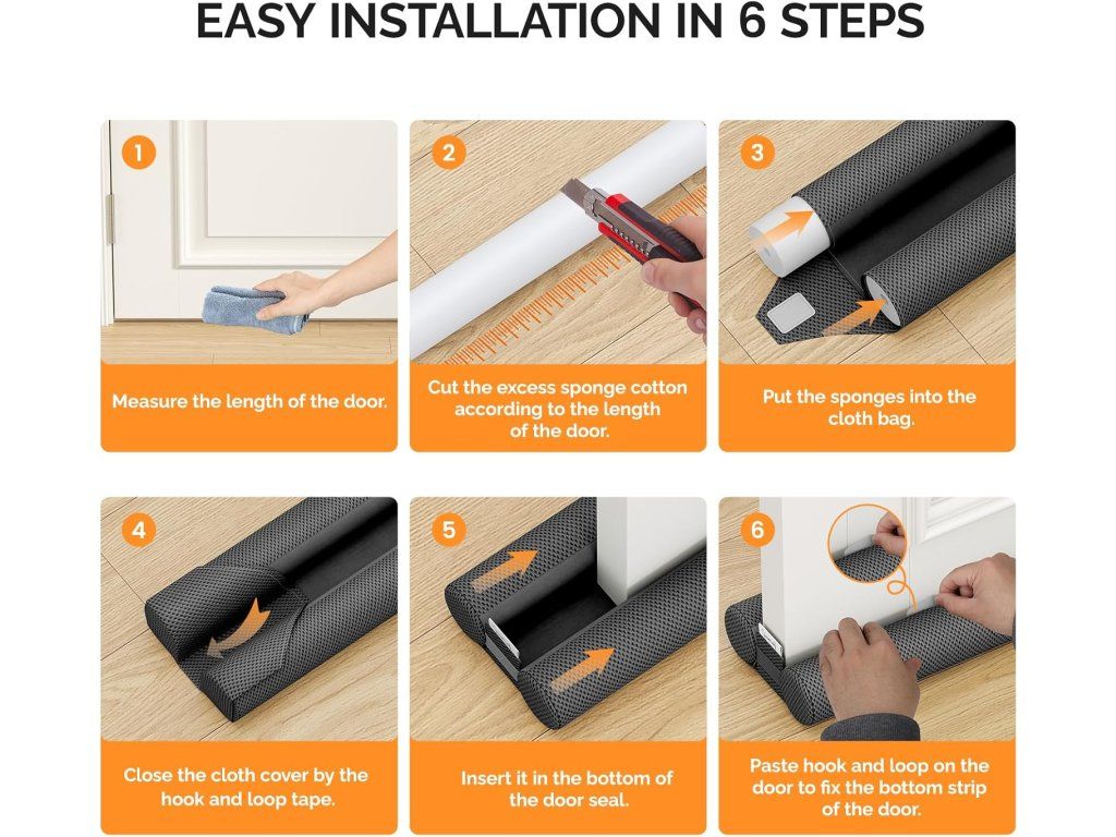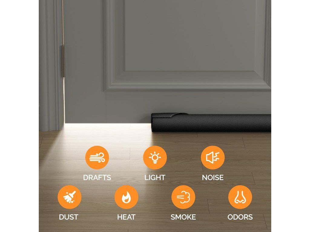 - Snadná instalace: bez nářadí — vložte potřebnou délku pěnové výplně a zasuňte pod dveře; přiložený přilepovací suchý zip (háček) zabrání posunu těsnění při otevírání dveří.