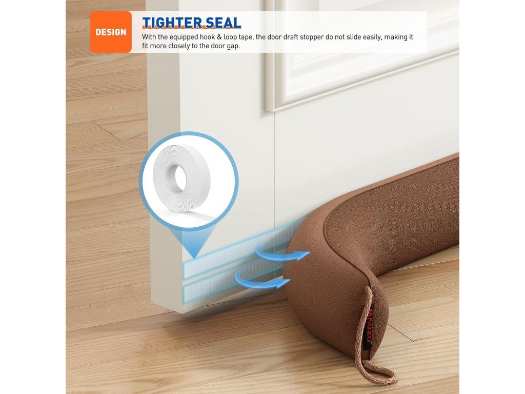 - Snadná montáž: Lze buď přilepit pomocí přiložené lepící pásky (suchý zip) nebo jednoduše vložit pod dveře — měkký materiál umožňuje přímé vsunutí i bez upevnění.