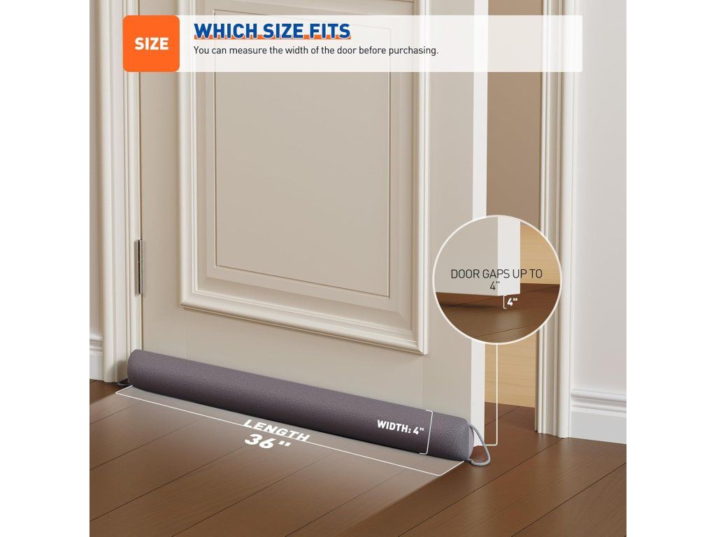 Obsah balení: 1× těsnění pod dveře (36"/91 cm), montážní suchý zip a dvě zavěsné smyčky. Technické údaje: Barva: šedá; Materiál: polyesterové rouno + skleněné kuličky; Rozměry: cca 92 × 10 × 10 cm (36 × 4 × 4 in); Maximální zaplnitelná spára: 92 cm; Hmotnost: cca 1,08 lb (≈0,49 kg); Značka: MAGZO.