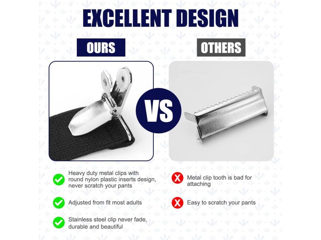 - Pevné kovové spony: nerezové gripper spony s plastovými zuby zabraňují poškození kalhot a sklouznutí