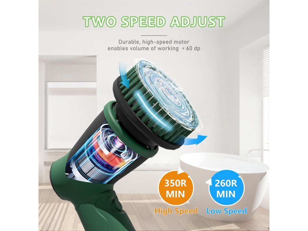 - Dva rychlostní stupně: nízká rychlost 260 ot./min pro jemné čištění, vysoká 350 ot./min pro náročné skvrny.