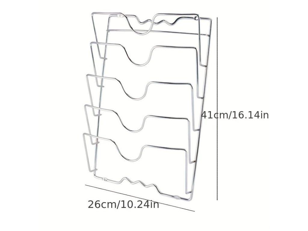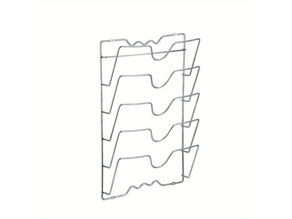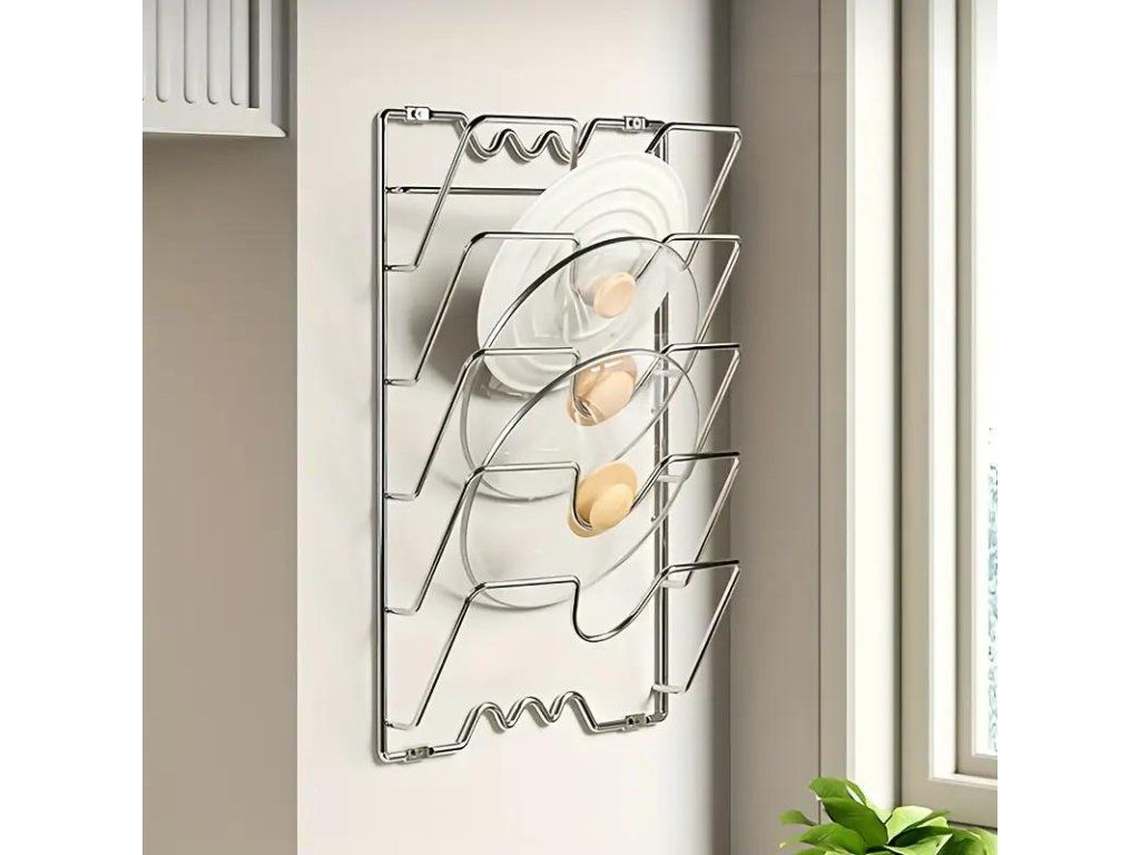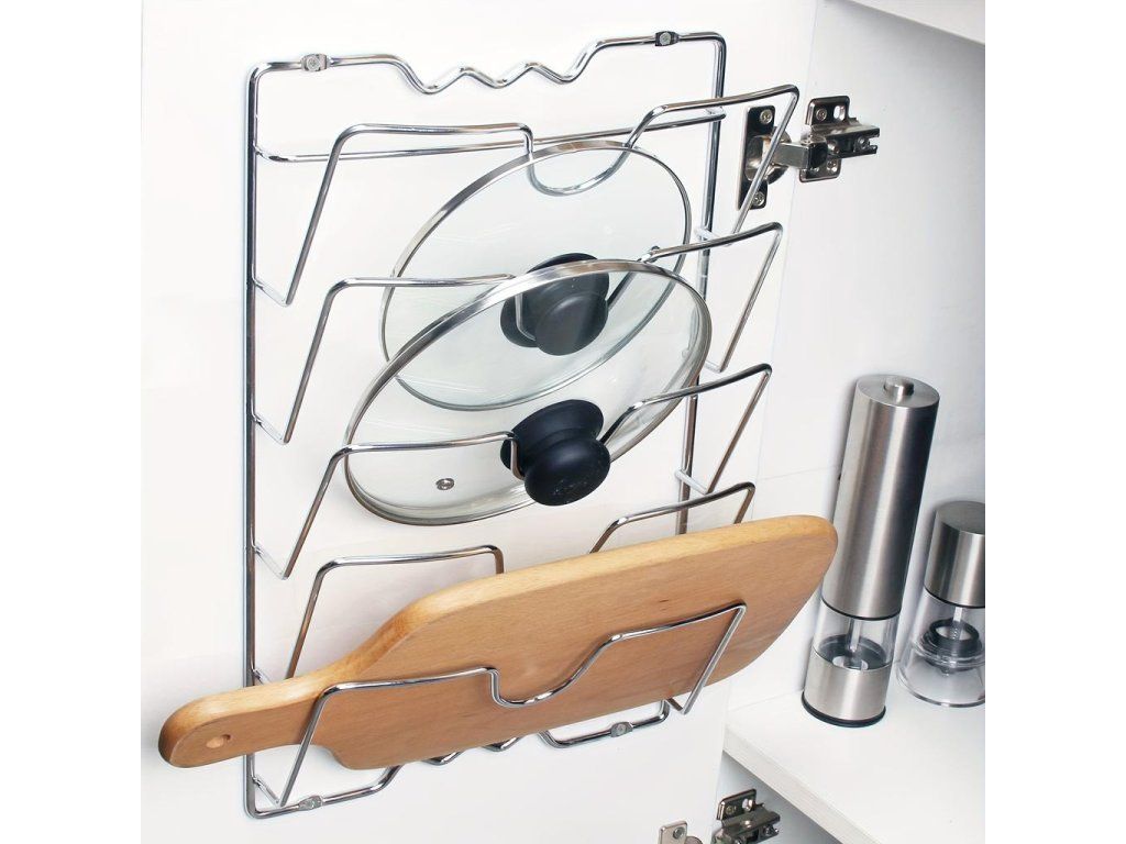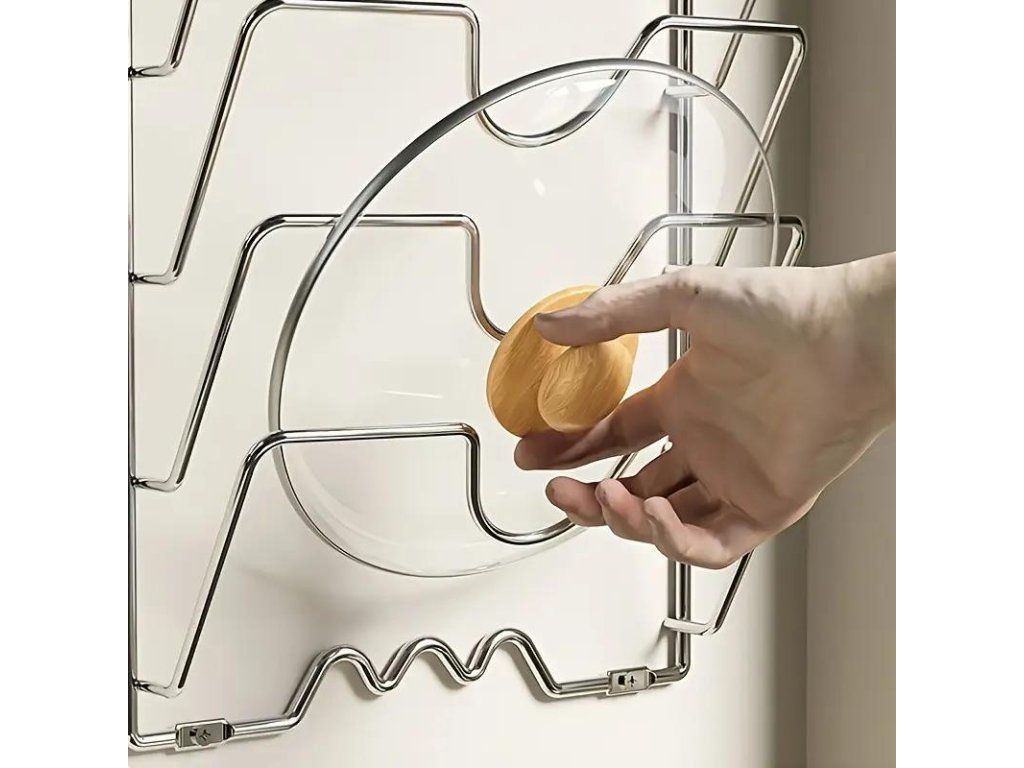 Tento držák není určen pouze na poklice od hrnců, lze jej použít také k uložení prkének a dalších kuchyňských doplňků.