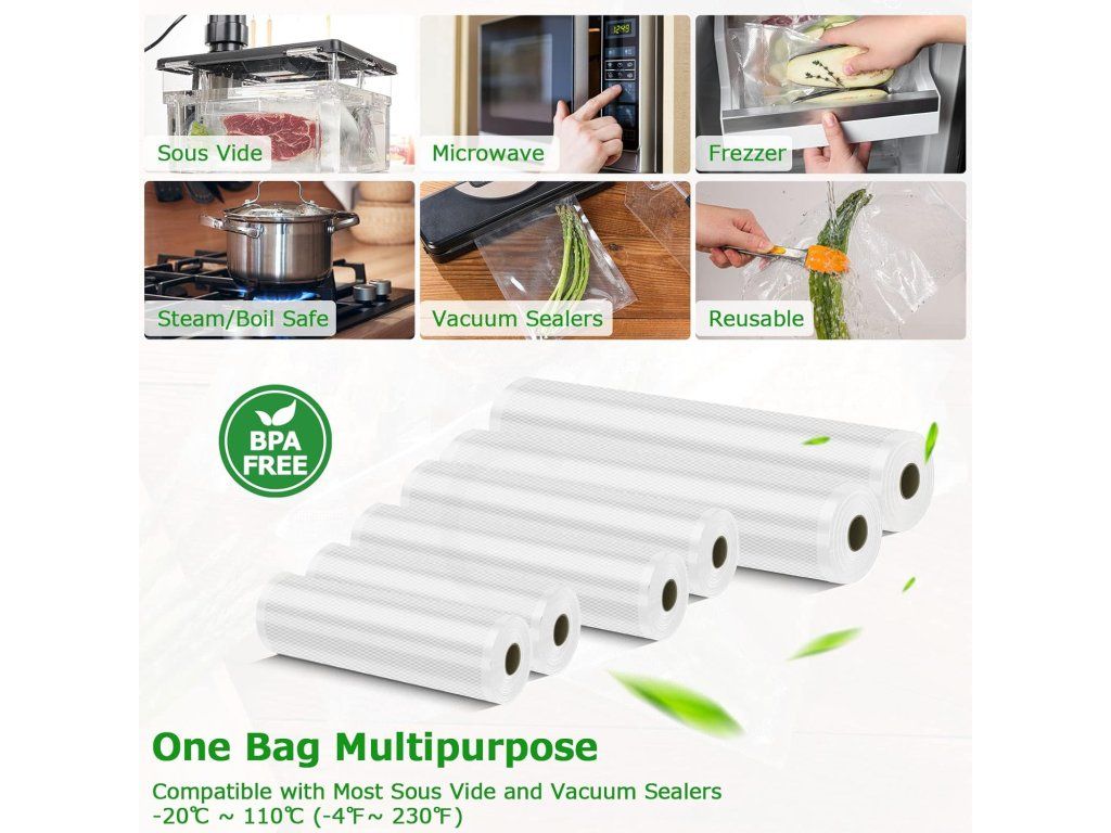 Obsah balení: 6 rolí (2×28×300 cm, 2×20×300 cm, 2×15×300 cm). Technické údaje: materiál bez BPA, opakovaně použitelný po umytí; hmotnost balení přibližně 620 g; rozměry balení 28,4 × 22,4 × 4,1 cm; kompatibilní s většinou vakuovacích strojů, vhodné pro mrazák, lednici, mikrovlnnou troubu a sous‑vide.