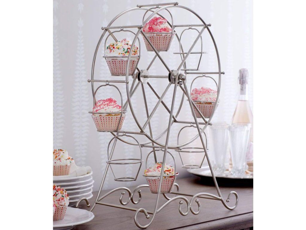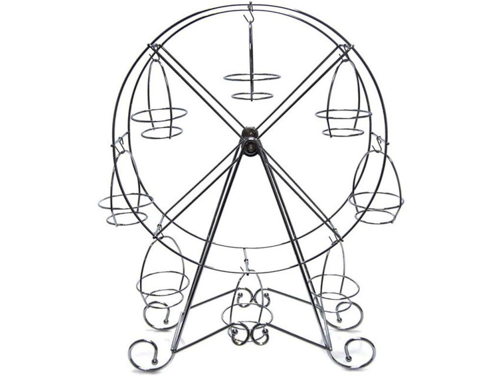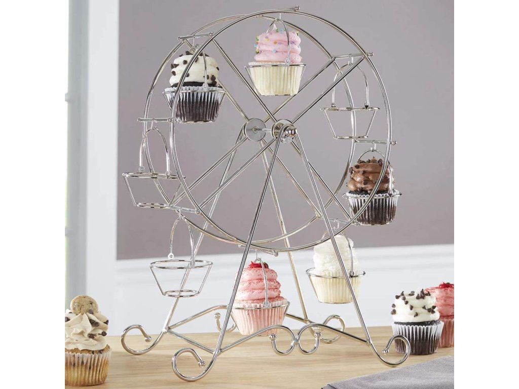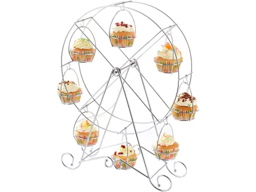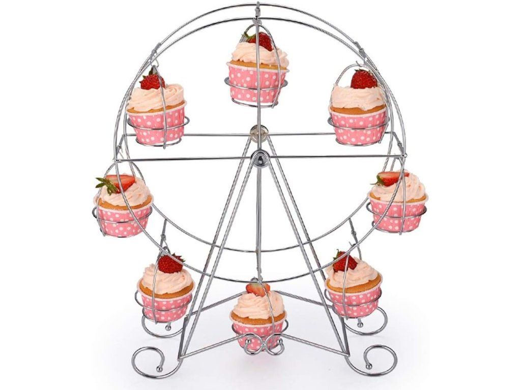 Stylově vystavte své dezerty s tímto dekorativním stojanem ve tvaru panoramatického kola od značky BAKAJI. Robustní kovová konstrukce a leštěný stříbrný povrch dodají vašemu stolování profesionální a slavnostní vzhled, zatímco osm pevných míst umožní přehledné a efektní uspořádání cupcakes či muffinů.