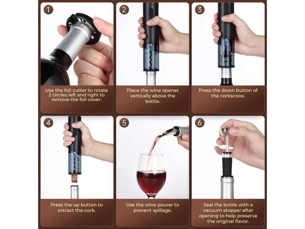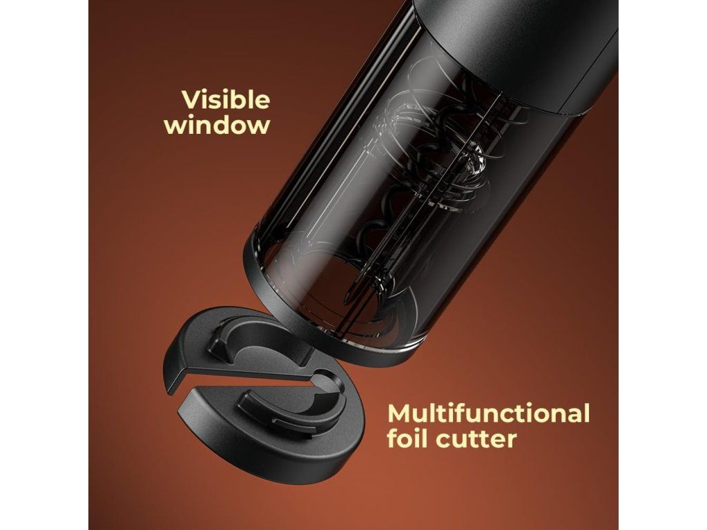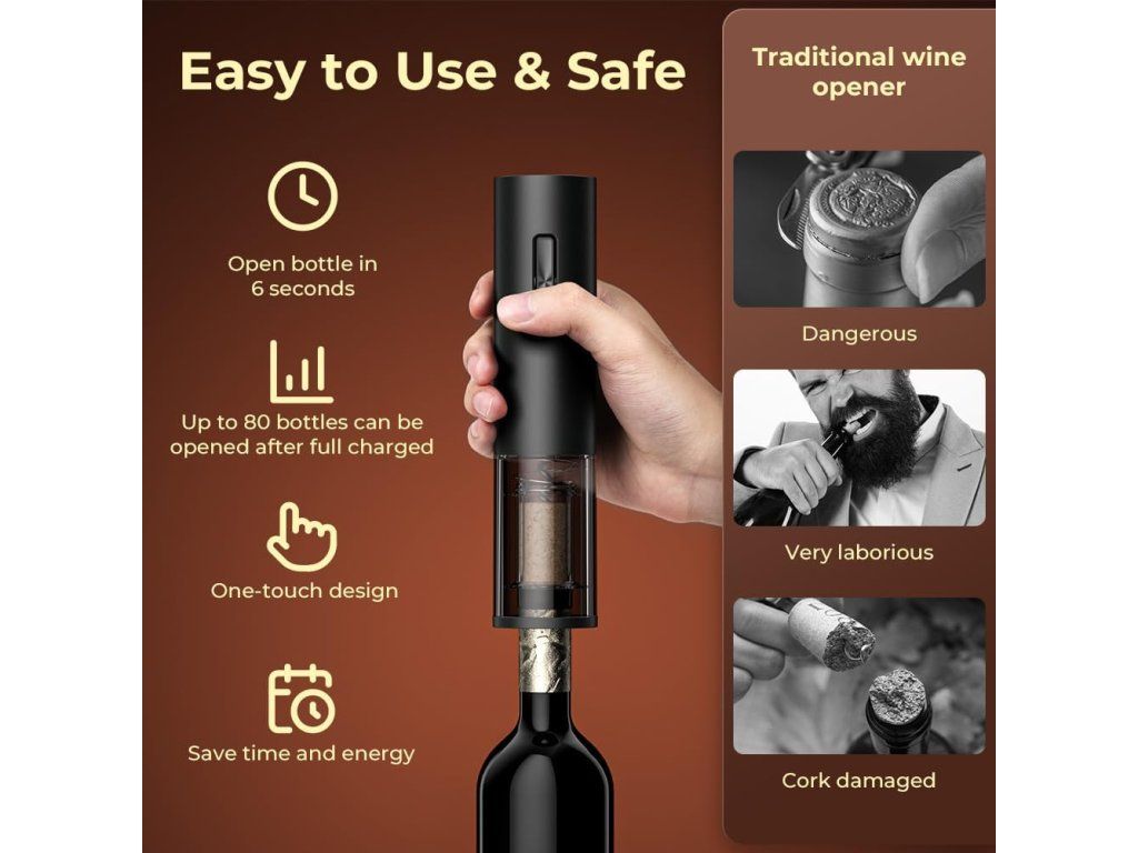 - Snadné otevírání: Automatický mechanismus vyjme zátku plynule a bezpečně – po plném nabití dokáže otevřít láhev za cca 8 sekund, aniž by zátku poškodil.
