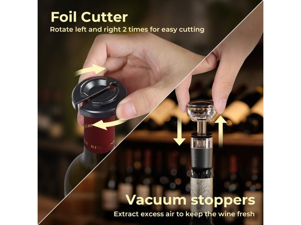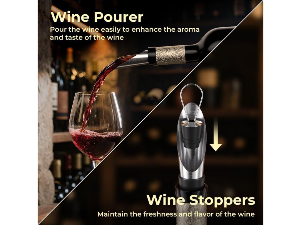 - All‑in‑one sada: Včetně praktického fóliového nože pro rychlé odstranění obalu, zátky pro uchování otevřeného vína a provzdušňovače s nalévákem pro lepší aroma a bezkapkové nalévání.