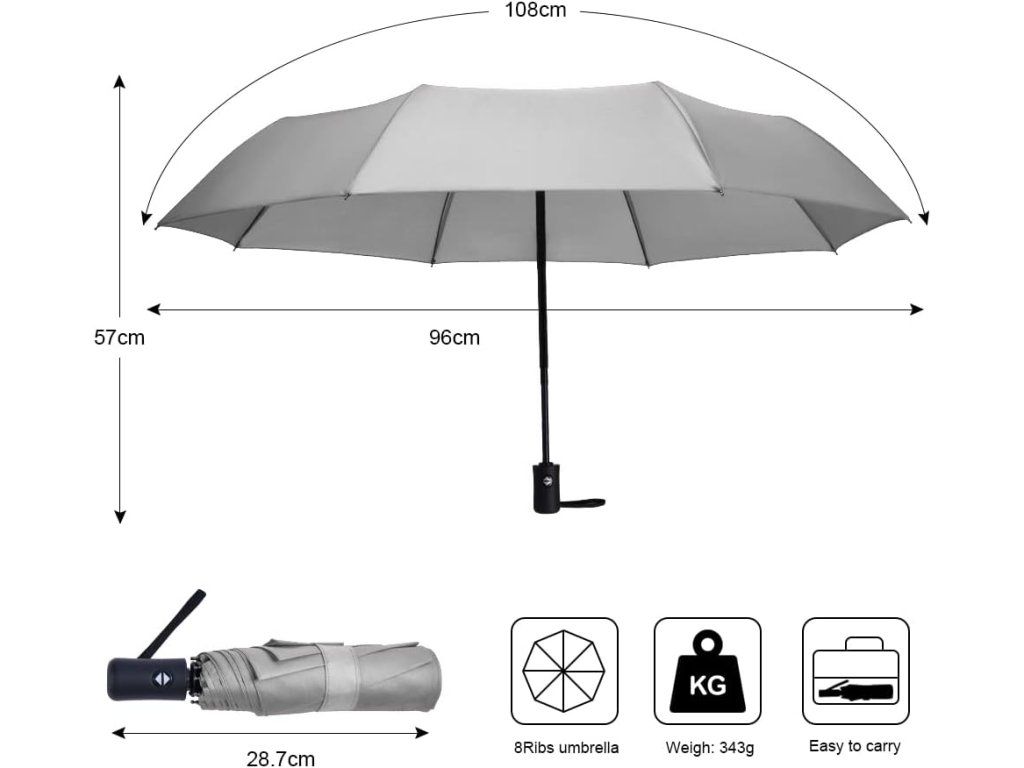 Obsah balení: Vicloon deštník a ochranné pouzdro. Technické údaje: barva šedá; počet žeber: 8; materiál kupole: nylon/polyester s Teflonovou úpravou; žebra: pryskyřicí zpevněné skelné vlákno; rám a rukojeť: nerezová ocel; otevírací mechanismus: tlačítko (automatické otevírání/zavírání); rozměry (přibližně): rozložený 96 x 57 cm, složený průměr/délka cca 30 cm; vhodné pro dospělé a děti; země původu: Čína.