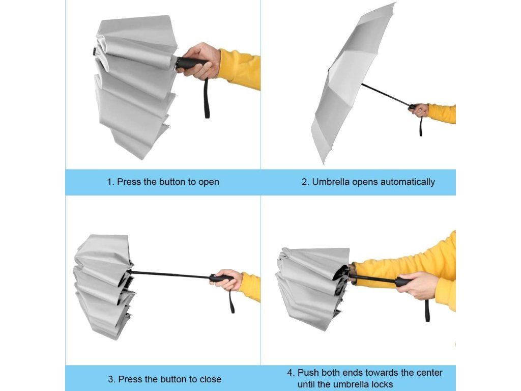 - Snadná údržba: Před uložením vždy uzavřete, vyhněte se drsným povrchům a lehce deštník potřeste, aby odkapalo přebytečné voda.